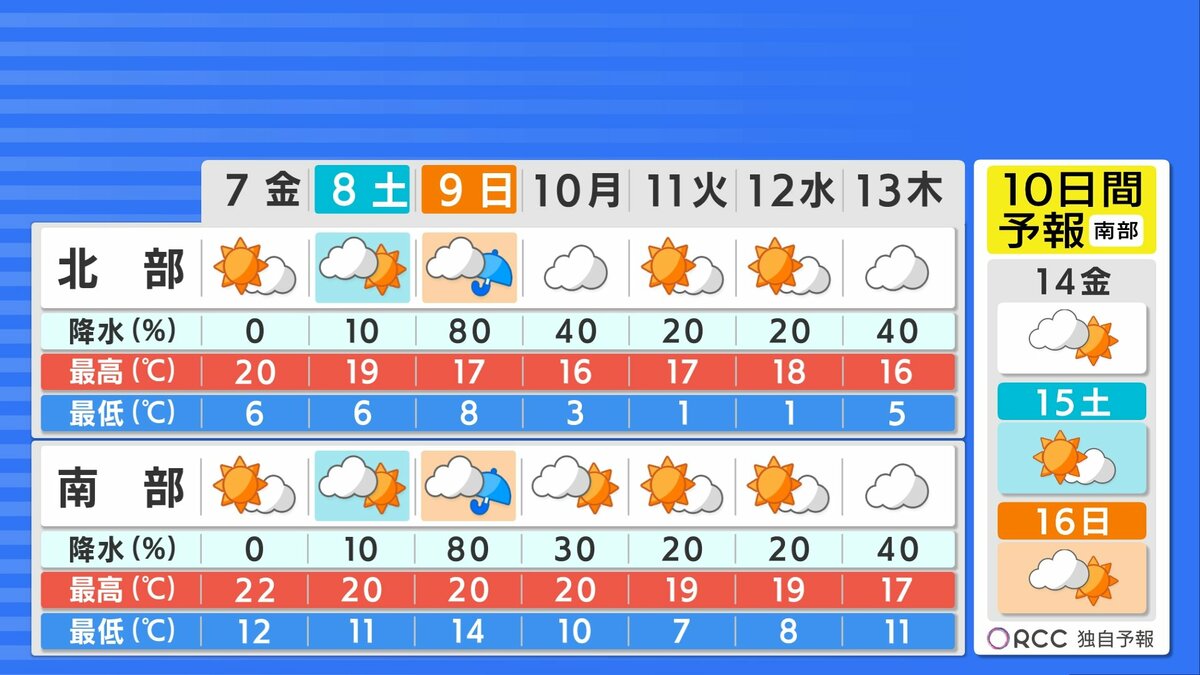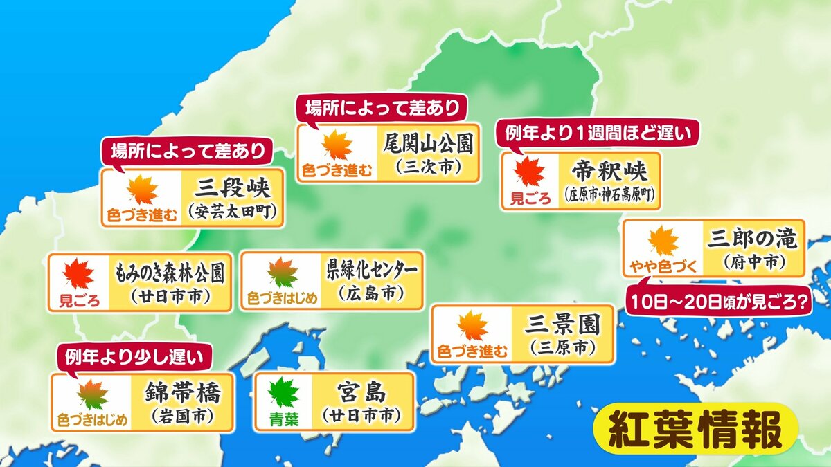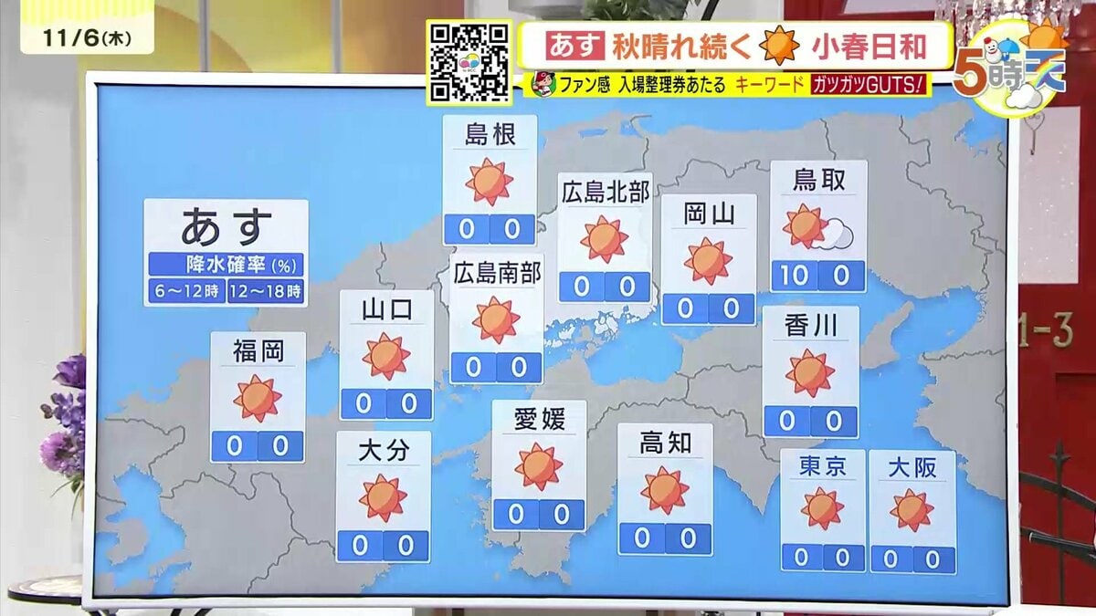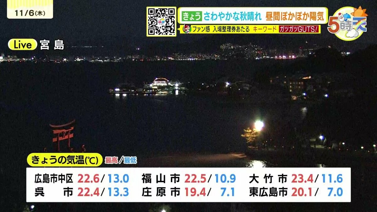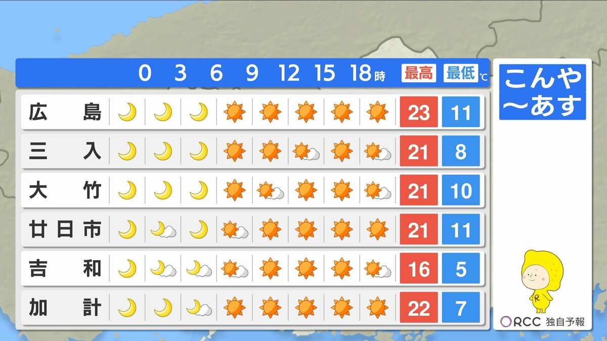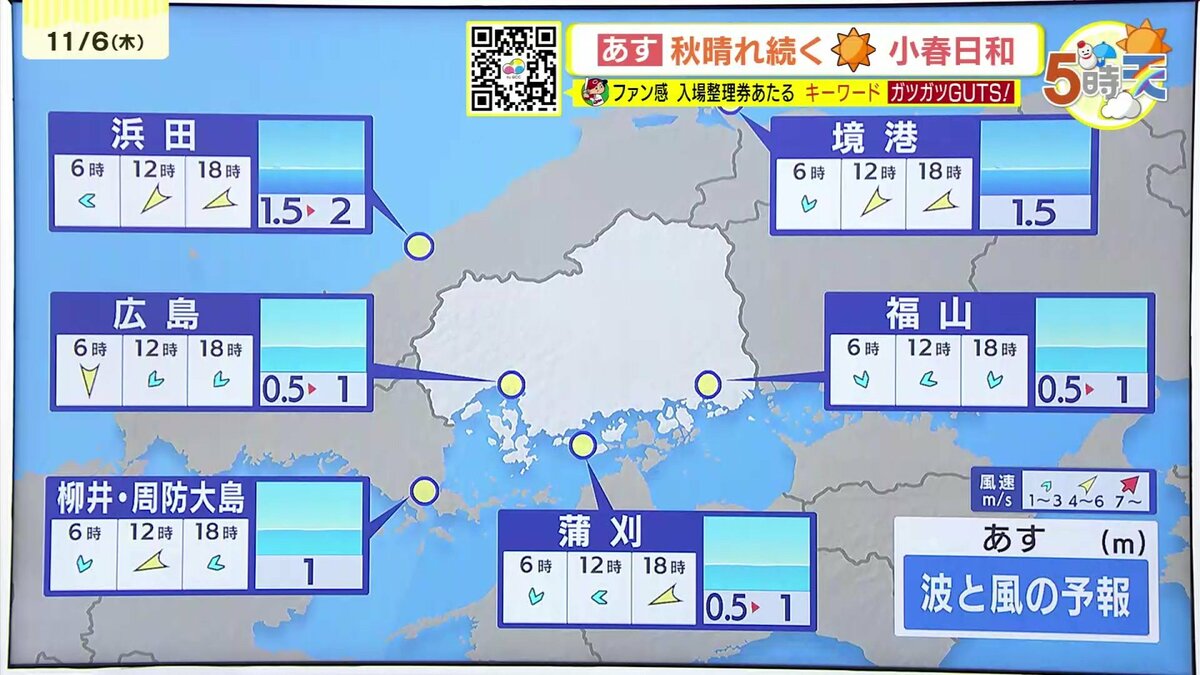 きょう6日(木)の広島県内は、雲が少なくよく晴れて秋晴れの空が広がりました。最高気温は、20℃を超えた地点が多く、昼間は上着いらずのぽかぽか陽気になりました。
