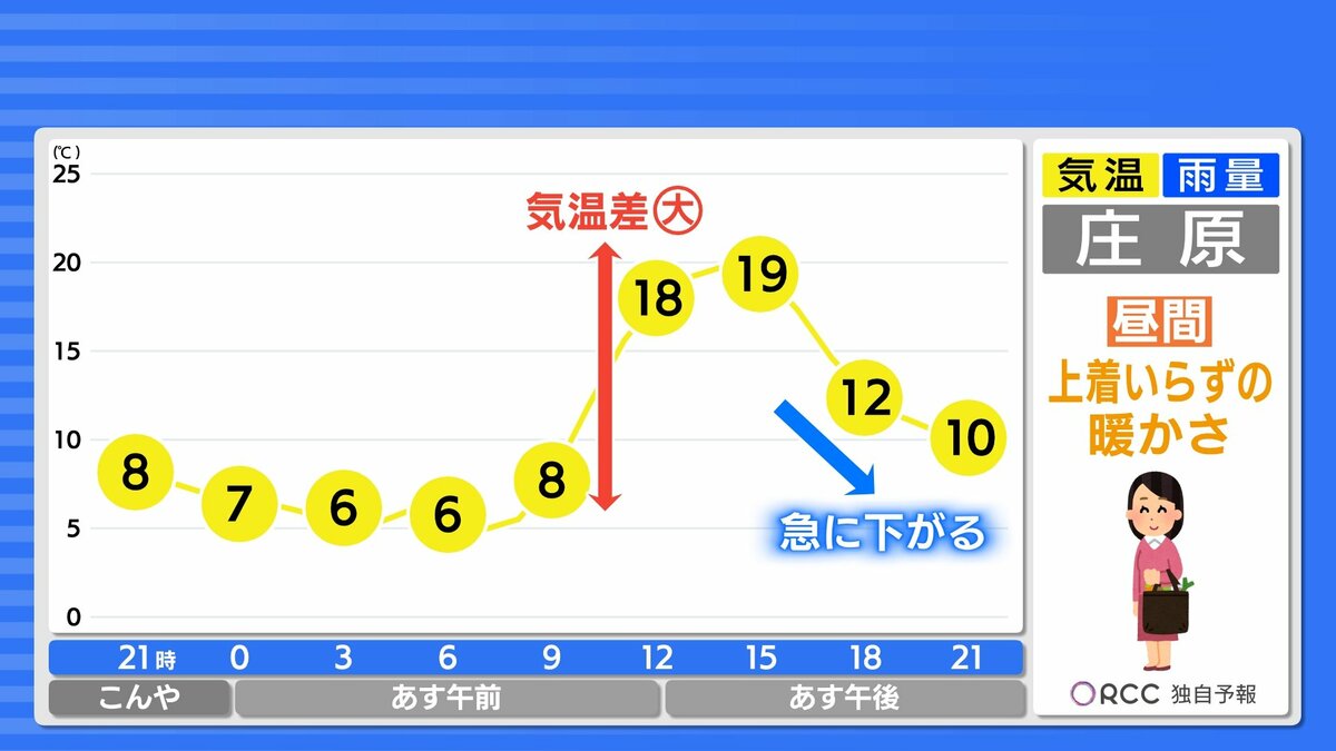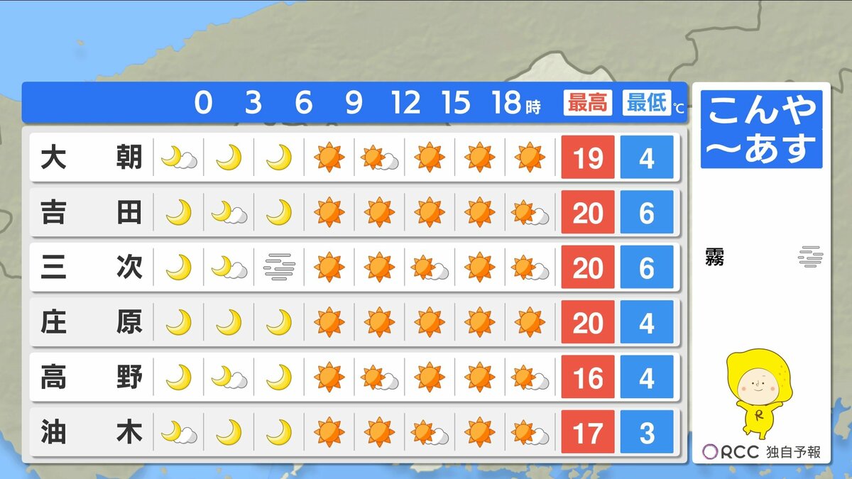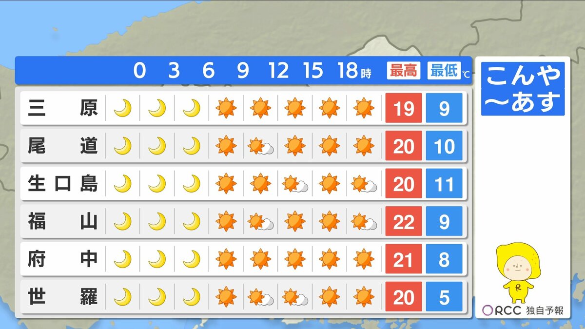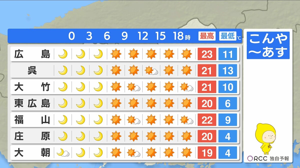 最低気温は、けさと同じくらいからやや低くなるでしょう。こんやも暖かくしてお休みください。日中はあすも20℃を超える地点が多く、昼間は上着いらずのぽかぽか陽気になりそうです。北部や内陸部を中心に一日の寒暖差が引き続き大きいため重ね着をしっかりしてお過ごしください。