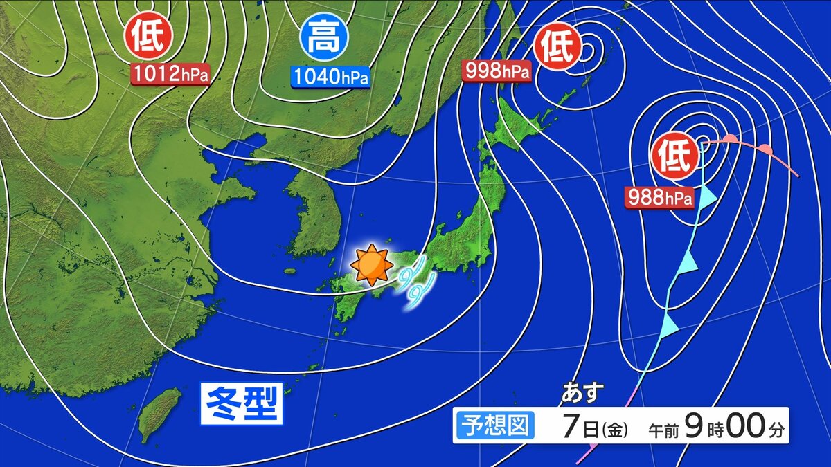 本州の東に位置する低気圧は発達しながら本州の東へさらに離れていき、あすは西高東低冬型の気圧配置になります。県内は、大陸の高気圧の影響で引き続き秋晴れの空が続くでしょう。あすも北寄りの風がやや強まる時間帯があるでしょう。