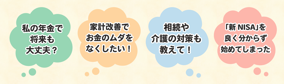 家計相談や資産運用、老後の備えまで丁寧なアドバイスにより、皆さまの疑問や不安を解消します。