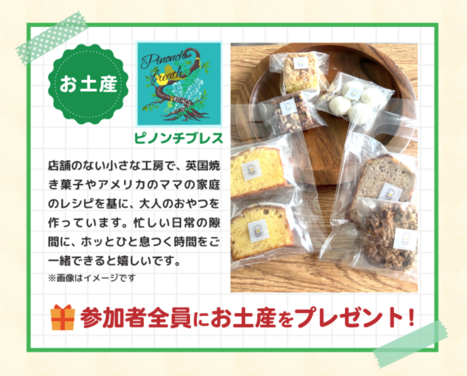 参加者全員に、イギリス風焼き菓子、アメリカの家庭焼き菓子を販売し、広島で人気を博している「ピノンチブレス」さんから焼き菓子のお土産をプレゼントします。