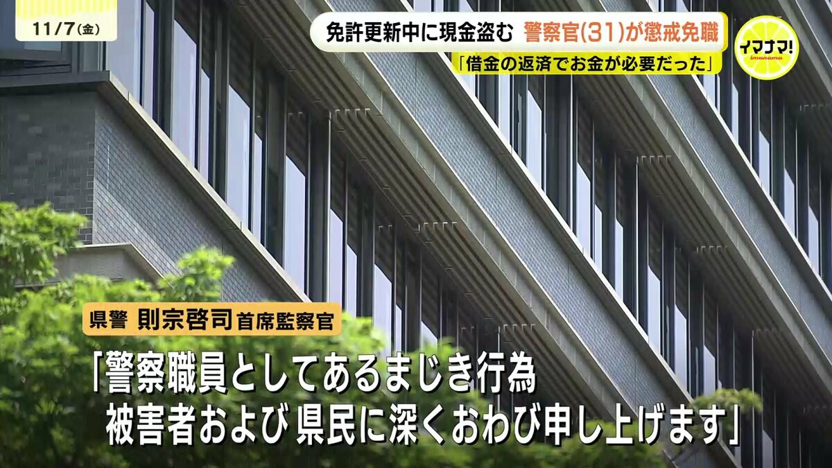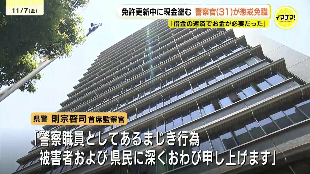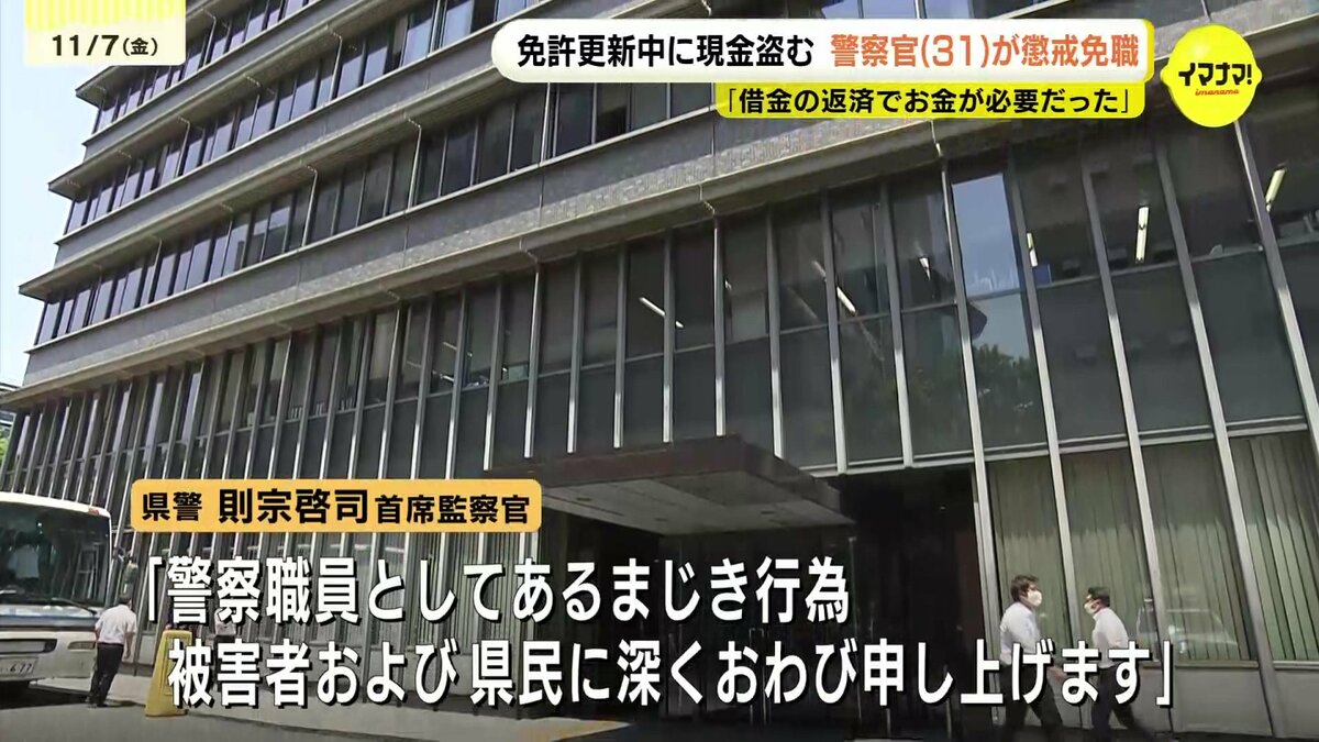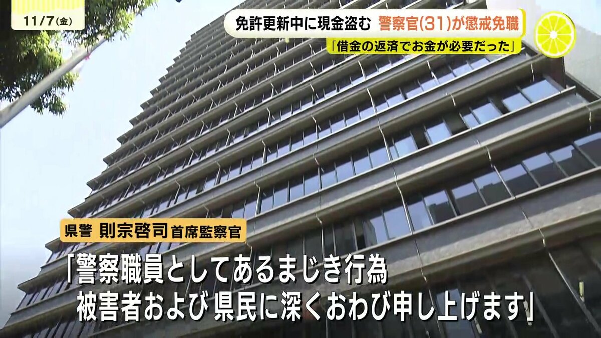 懲戒免職となったのは、巡査長の男(31)です。県警の発表などによりますと、男は3月から7月ごろまでの間、竹原警察署の大崎上島分庁舎で、免許更新で訪れた女性から現金1万円を盗んだほか、そのほか9人から現金を盗んだ疑いが持たれています。