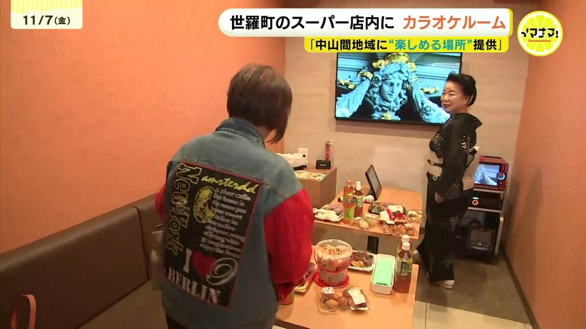 「きょう、こちらのスーパーにオープンしたのは、なんと、カラオケルームです。防音も整っており、外へ音がもれる心配はありません」