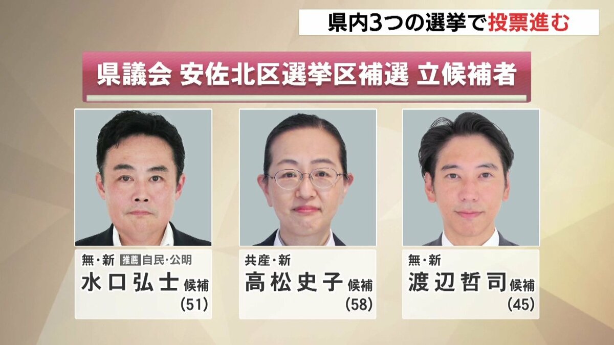 さらにご覧の3人が立候補している、広島市安佐北区の県議会議員補欠選挙の投票も行われています。