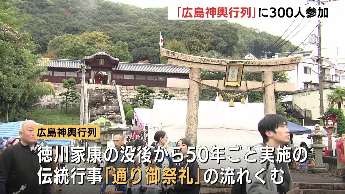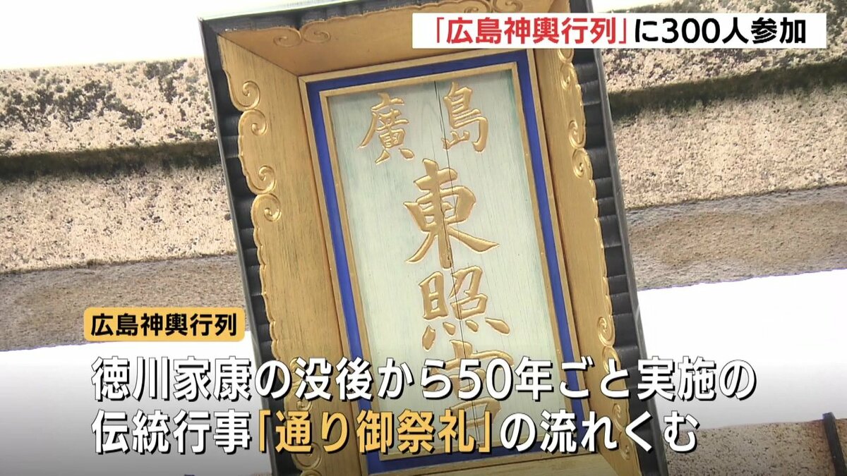 時代衣装を身にまとった約300人が参加する「広島神輿行列」は、広島東照宮の御祭神である徳川家康の死没から50年ごとに行われてきた伝統行事「通り御祭礼」の流れを汲むものです。