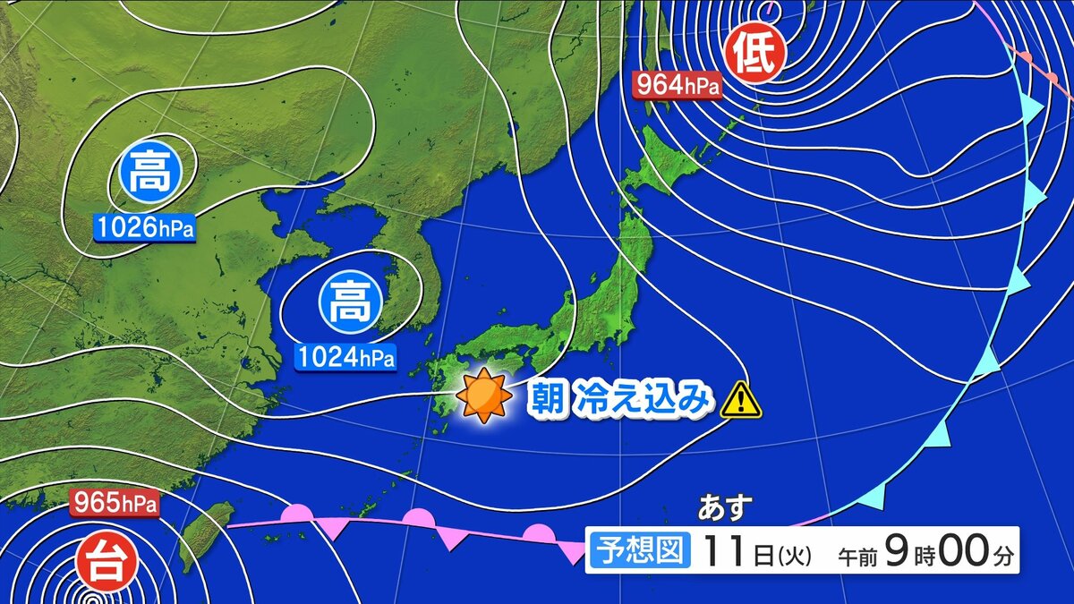 きょうは一時的に冬型の気圧配置になりましたが、あすにかけて大陸の高気圧が近づき、冬型は緩みます。高気圧に覆われ、あすも安定した晴天が続くでしょう。また、冬型が緩んだ直後の朝は冷え込みが強まります。こんやからあす朝にかけて大きく気温が下がり、あす朝は冷え込みが強まるためご注意ください。