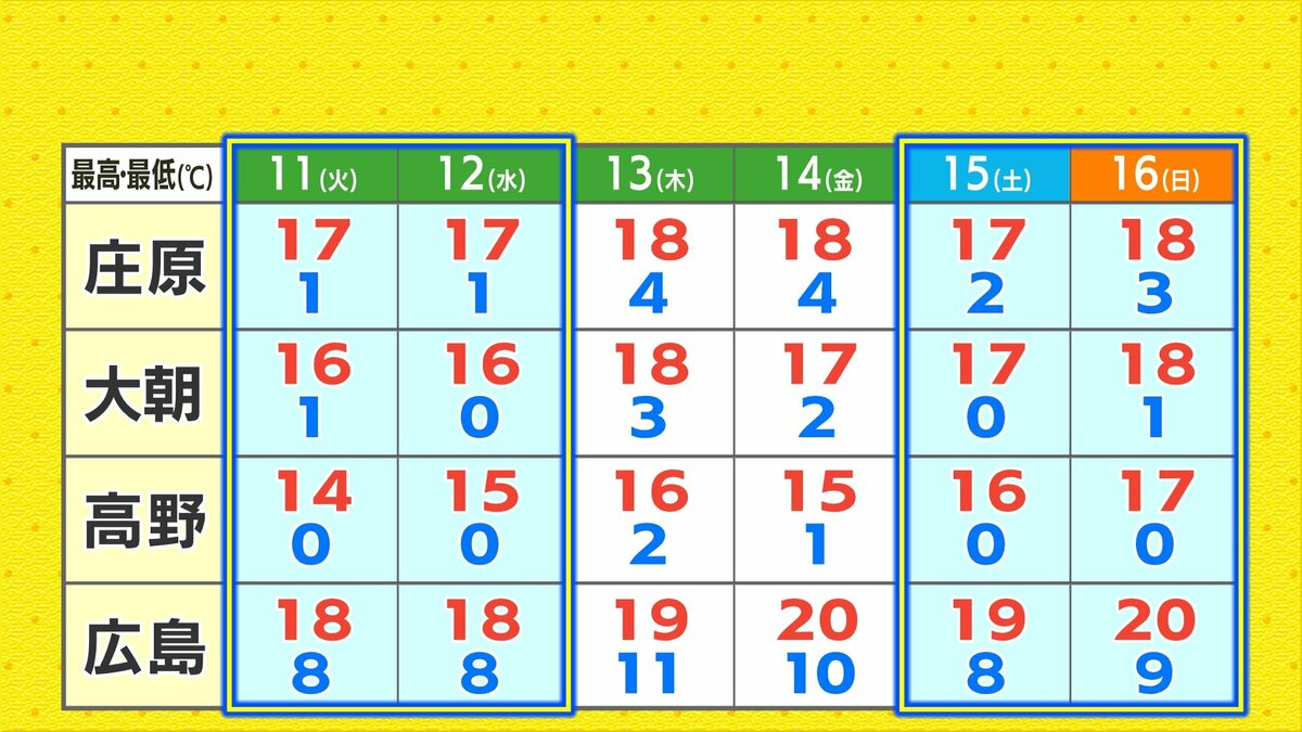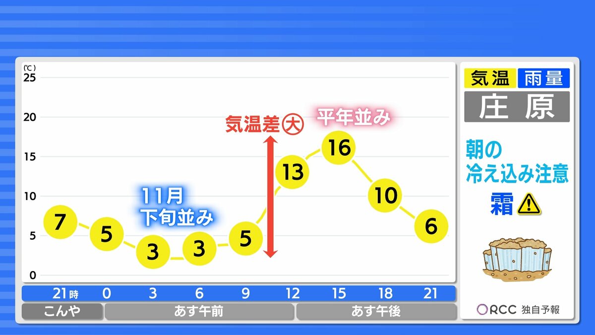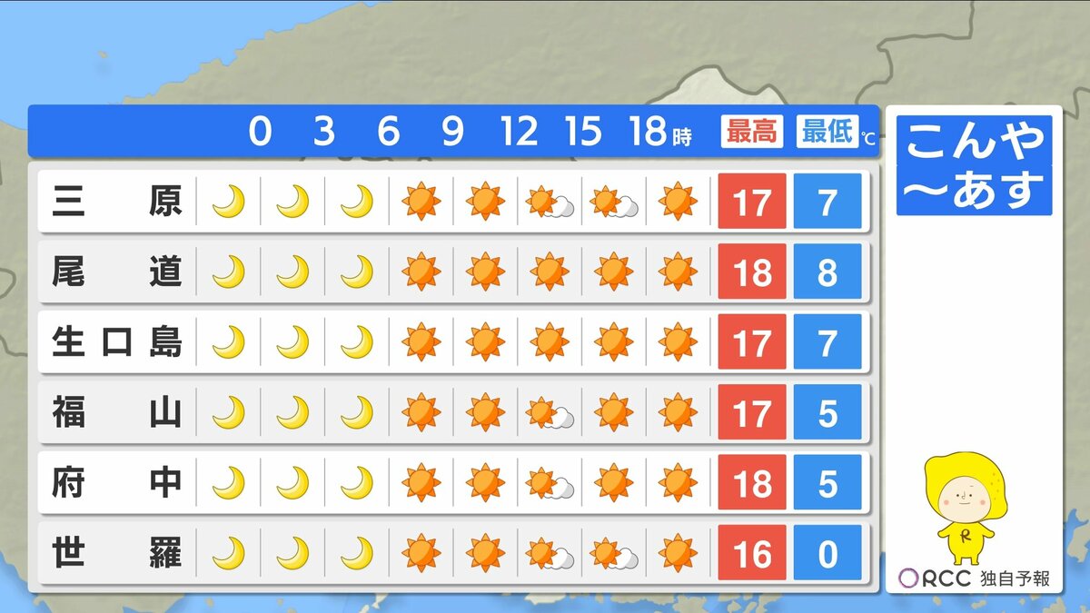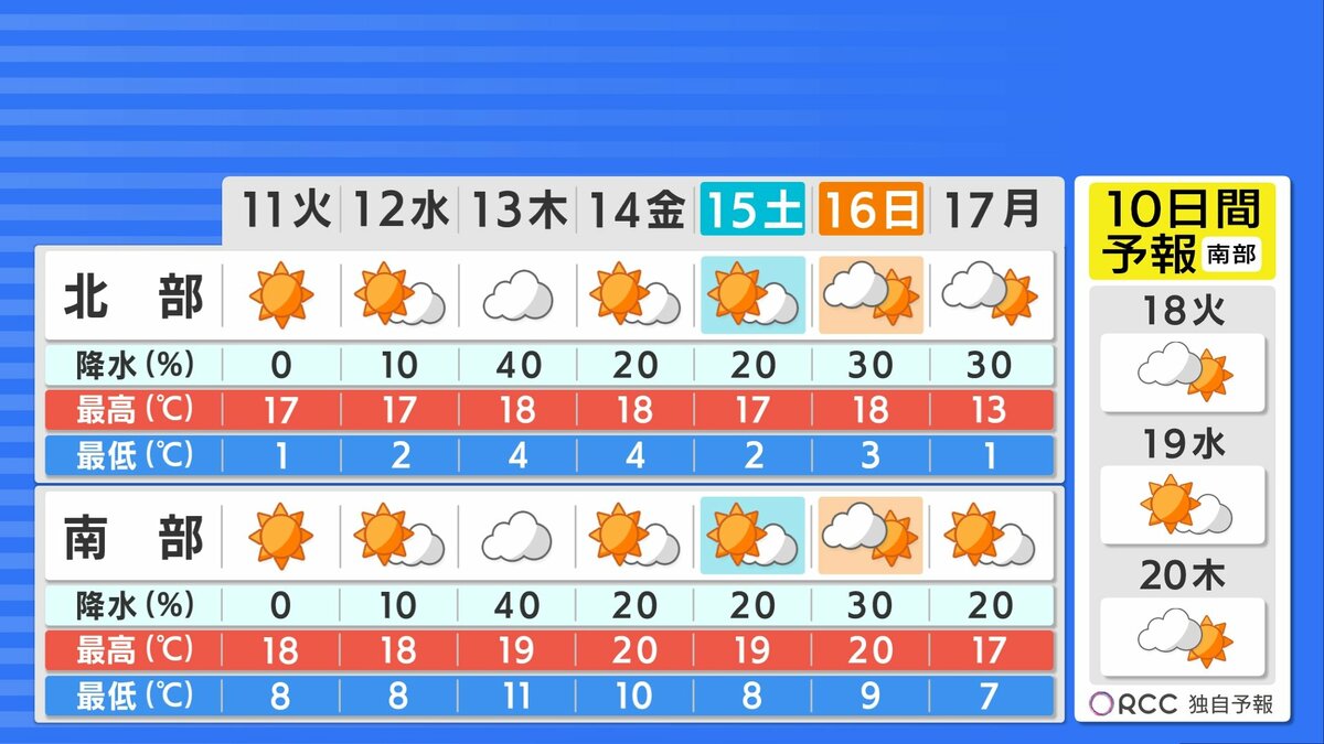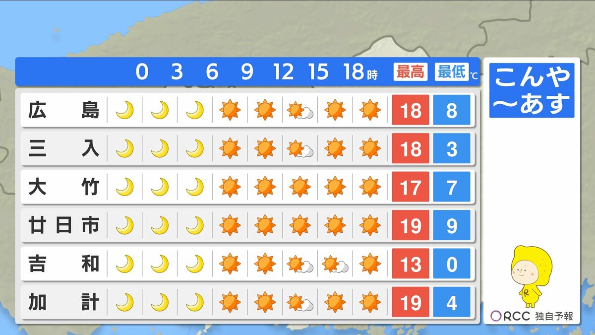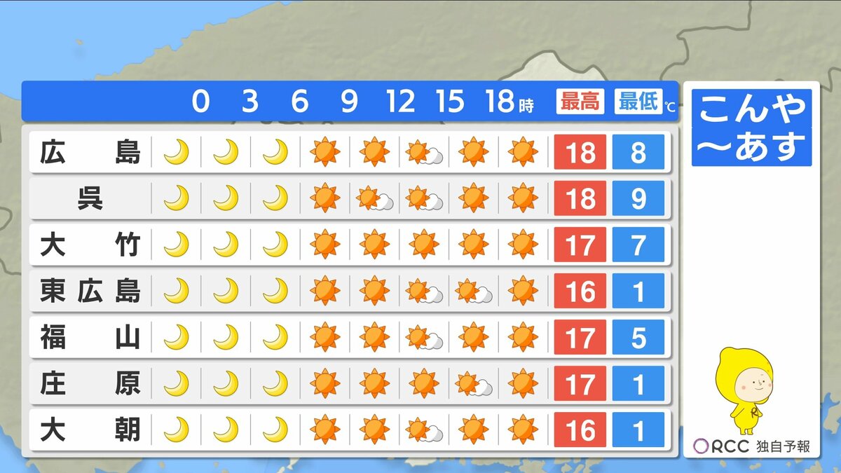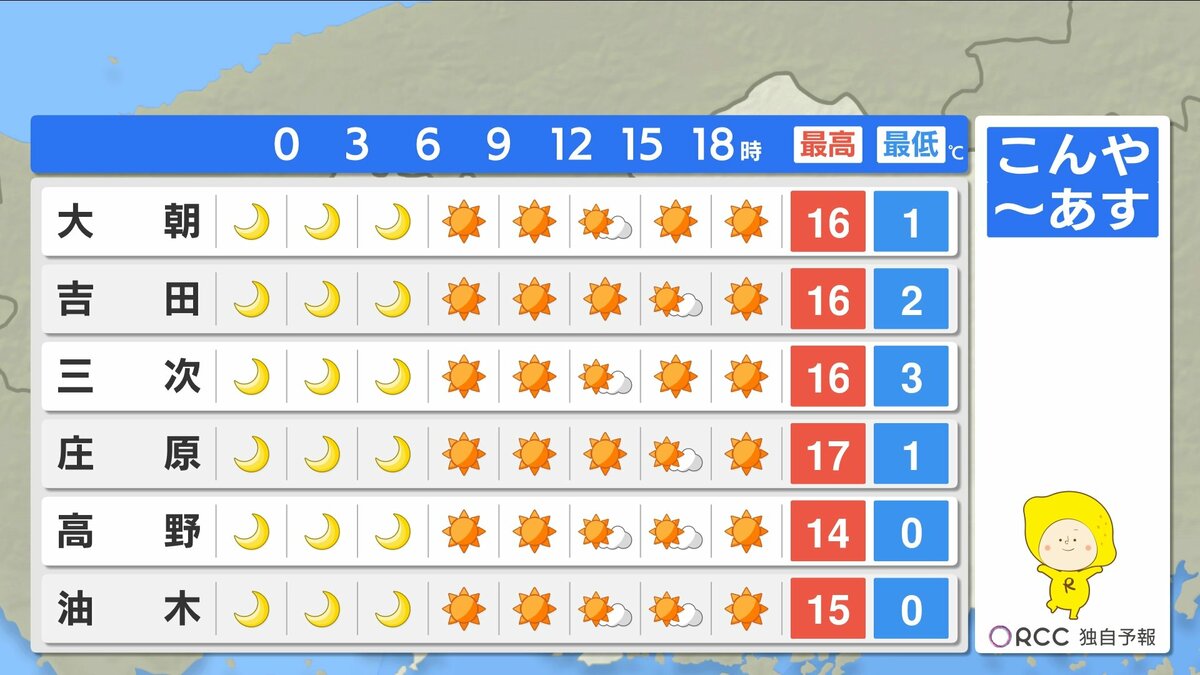 あすの朝は、沿岸部でも1ケタの冷え込み、北部や内陸部では0℃近くまで冷え込むでしょう。寝ている間に風邪を引かないよう、今晩は暖かくしてお休みください。最高気温は16℃~18℃の地点が多く、この時期らしい気温になるでしょう。一日の寒暖差がかなり大きいですのでご注意ください。