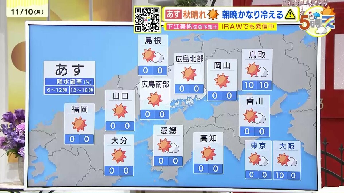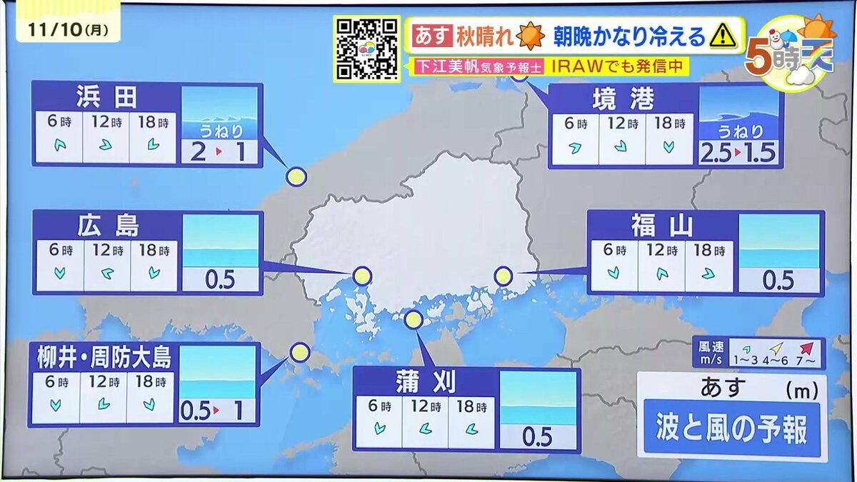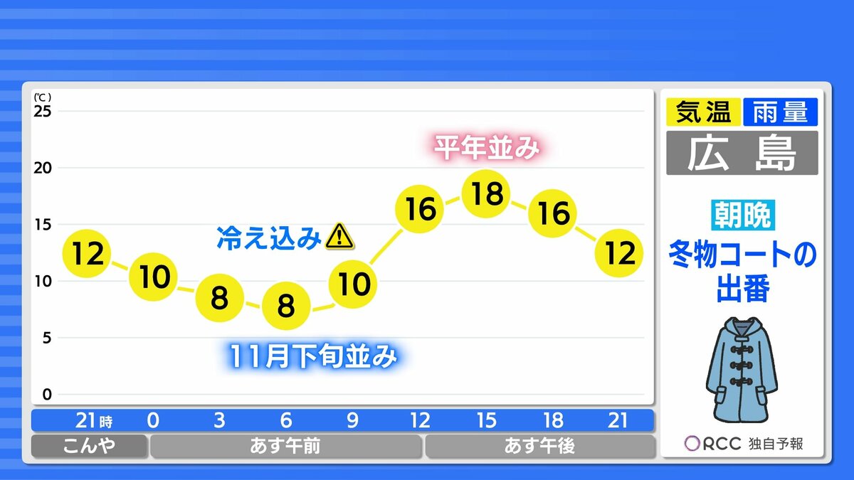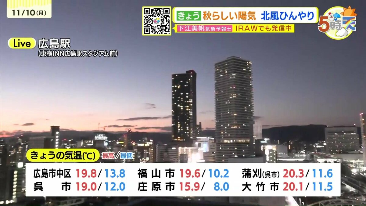 きょう10日(月)の広島県内は、秋晴れの空が広がり、日差しが暖かかったですが、北風が強かったため、日陰に入るとひんやり北風が冷たい一日になりました。最高気温は、蒲刈で20.3℃ 大竹で20.1℃まで上がりました。