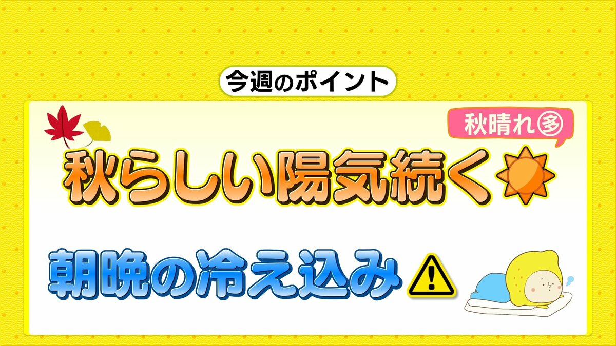 今週は、安定した晴天の日が多いでしょう。木曜日は、気圧の谷が通過するため雲が広がりやすくなる見込みです。最高気温は20℃近くまで上がる日が多く、昼間は小春日和ですが、今週は朝晩の冷え込みがぐっと強まるため、脱ぎ着のしやすい服装でお過ごしください。はやめに本格的な冬物の準備など、冬支度をはやめに進めた方が良さそうです。