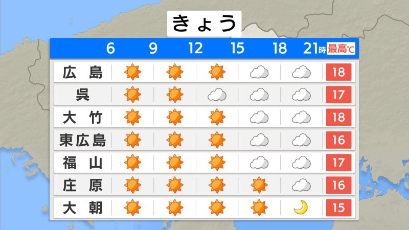 けさ(12日朝)の広島県内は、雲が多くなっているところもありますが、おおむね晴れています。最低気温は広島市中区9.3℃・福山市6.7℃・北部の庄原市で2.1℃・北広島町大朝ー0.4℃で、氷点下は1地点でした。