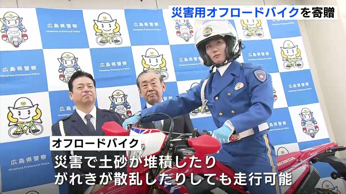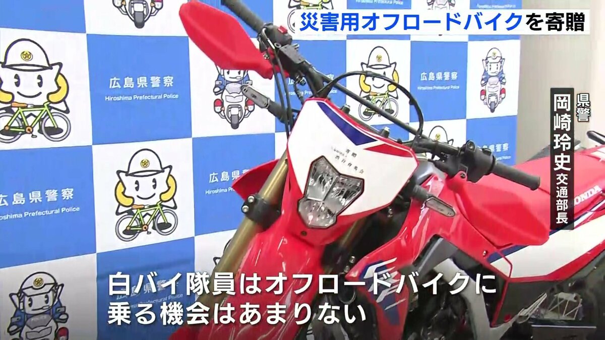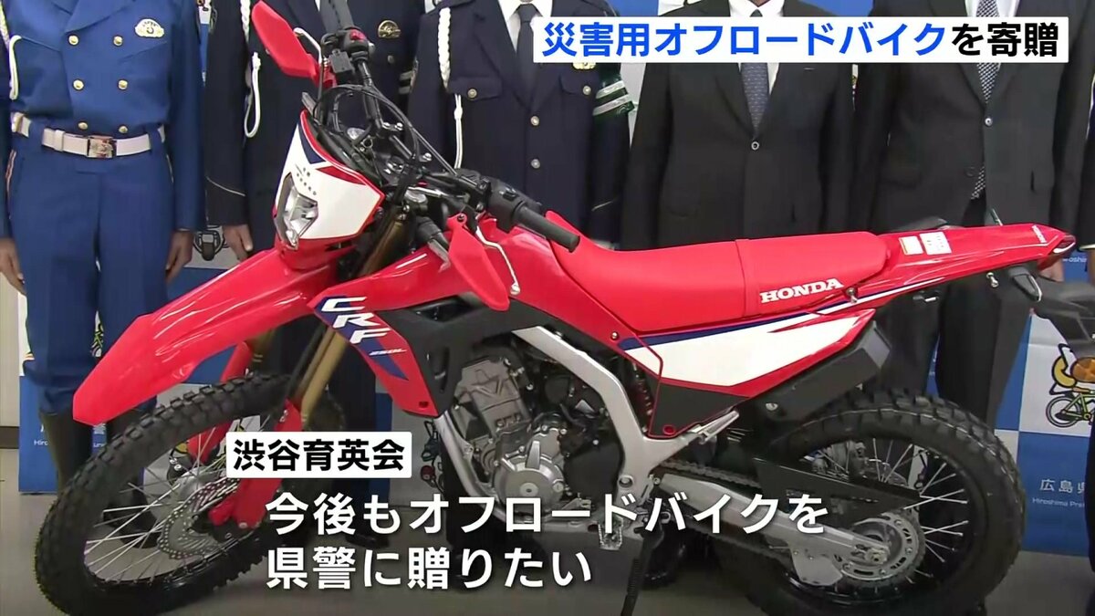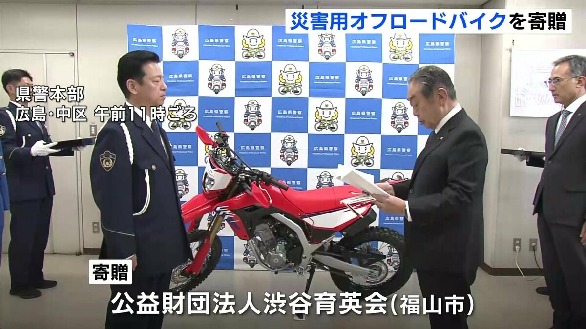 福山市の公益財団法人渋谷育英会が、災害で悪路となった道でも走行できる「オフロードバイク」を広島県警に寄贈しました。