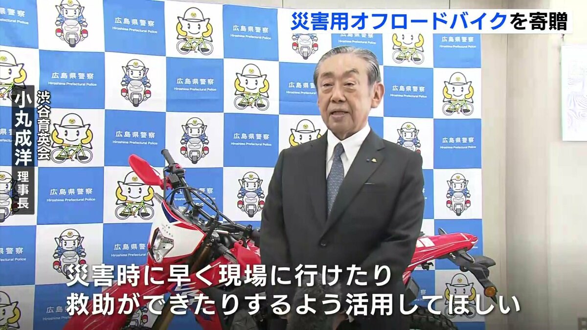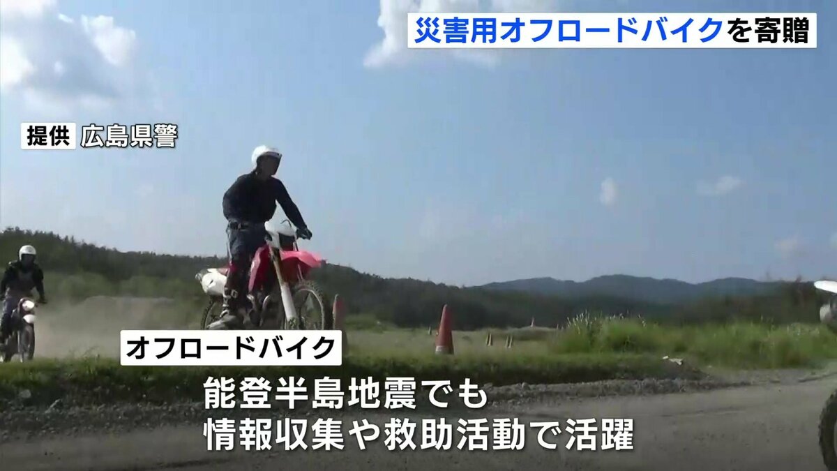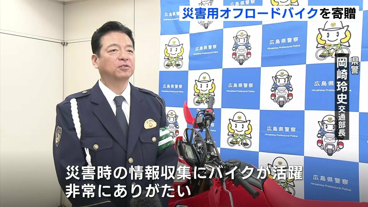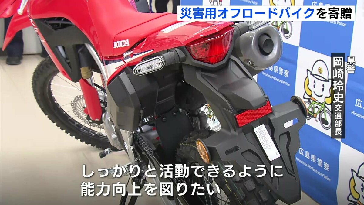 福山市の公益財団法人渋谷育英会が、災害で悪路となった道でも走行できる「オフロードバイク」を広島県警に寄贈しました。
