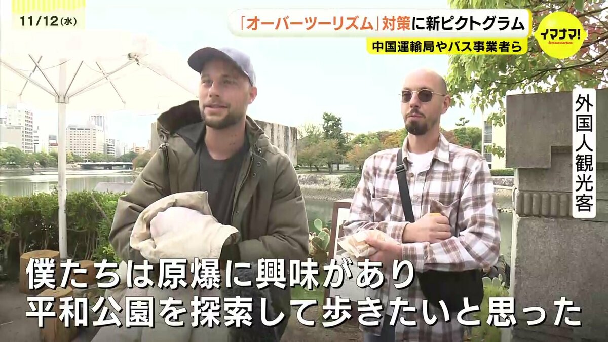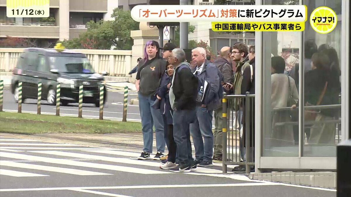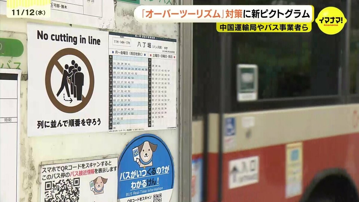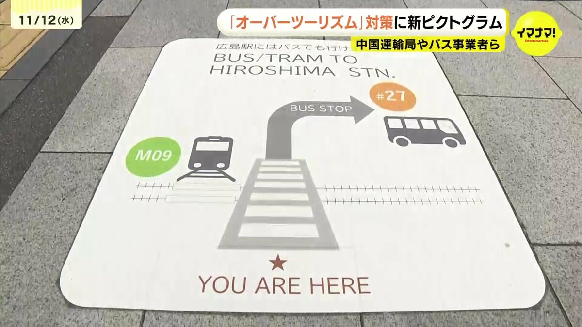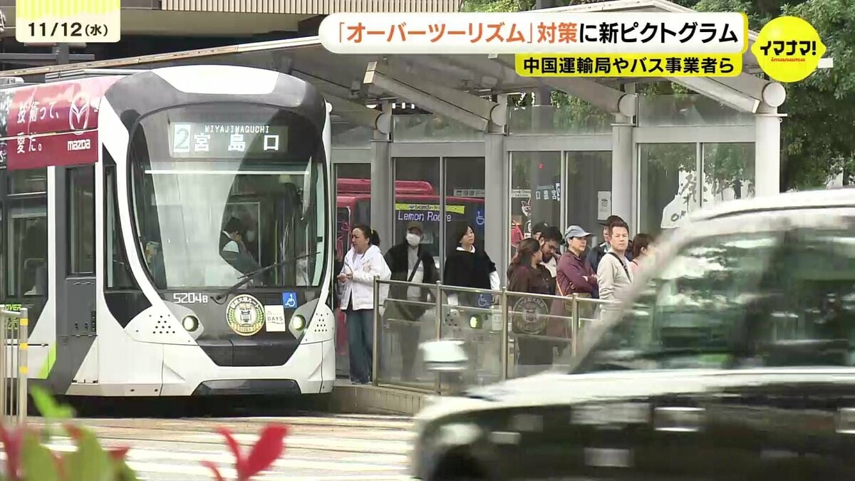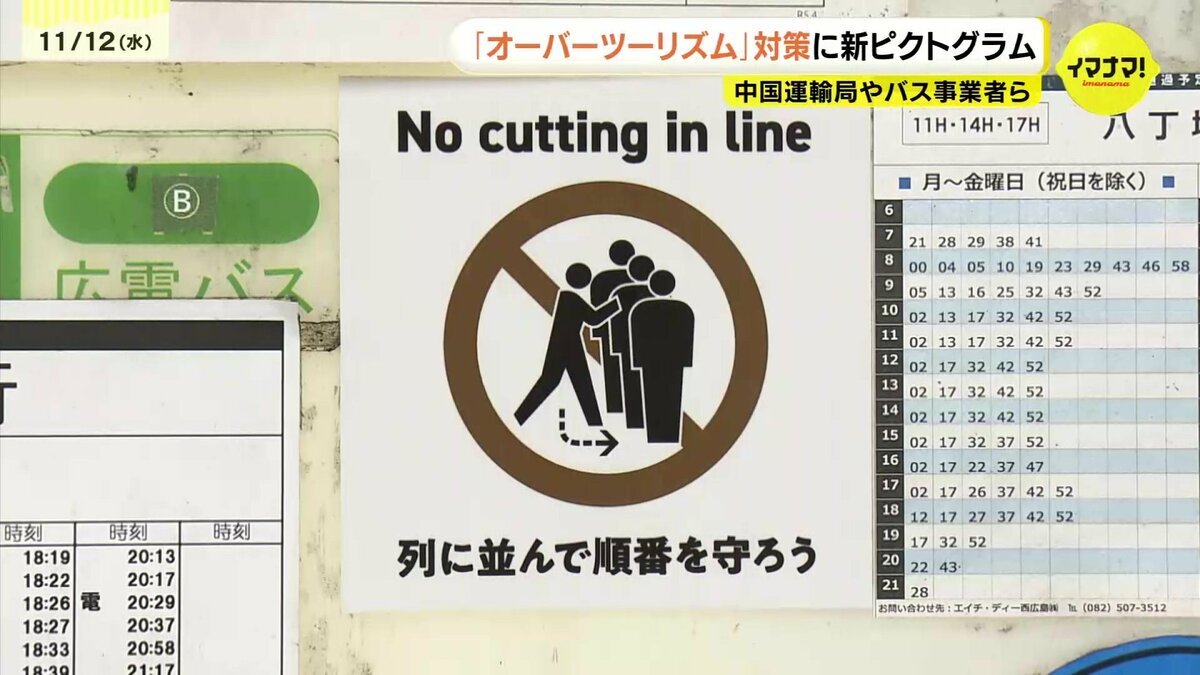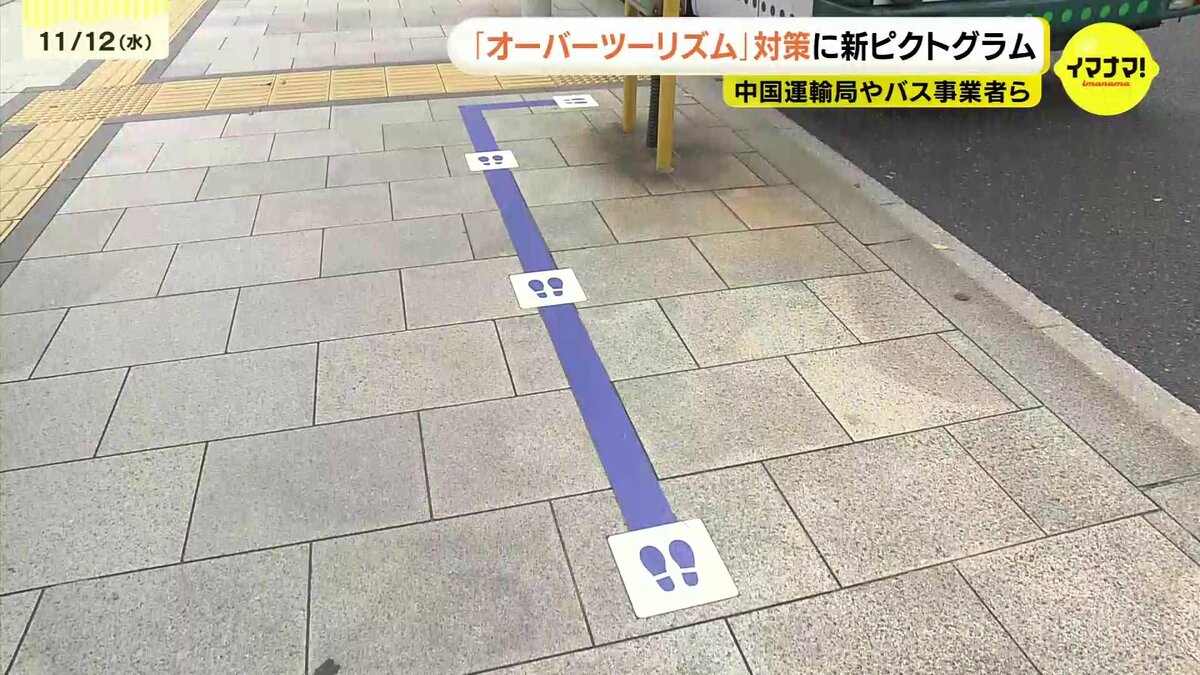 こうした「オーバーツーリズム」の対策に、中国運輸局やバス事業者と広島市が乗り出しました。12日朝、原爆ドーム北側のバス停には、歩行者の妨げや割り込み乗車でトラブルにならないようにイラストで分かるピクトグラムが貼り出されたほか、路面の徒列ラインも整備されました。