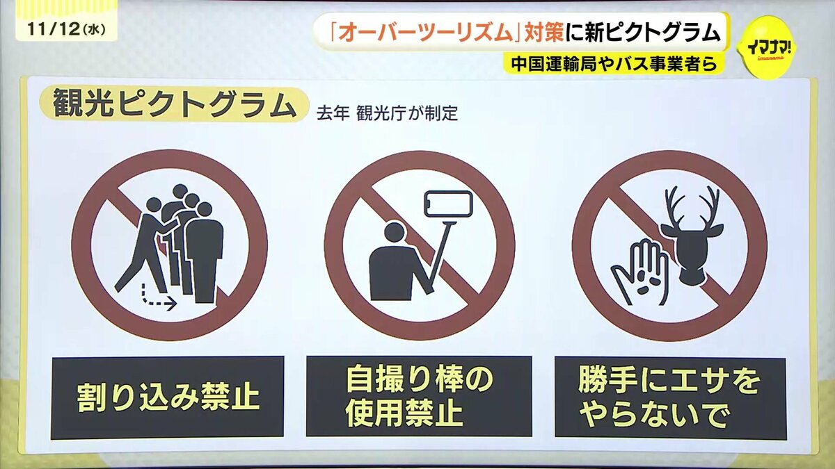 ピクトグラムは、外国人観光客の増加を受けて去年、観光庁が制定したものです。今回バス停に掲示された「割り込み禁止」のほかにも、「自撮り棒の使用禁止」「勝手にえさをやらないで」など、全部で22種類があります。