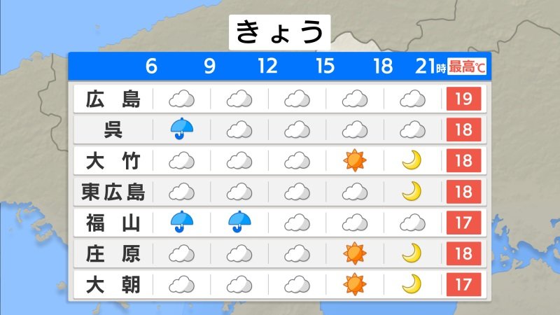 きょう13日(木)の広島県内は、雲が多く冷え込みは弱い朝となりました。最低気温は、広島市中区12.9℃、呉市14.0℃、三次市8.7℃、庄原市高野町5.4℃、きのうとくらべると3~5℃高くなっています。