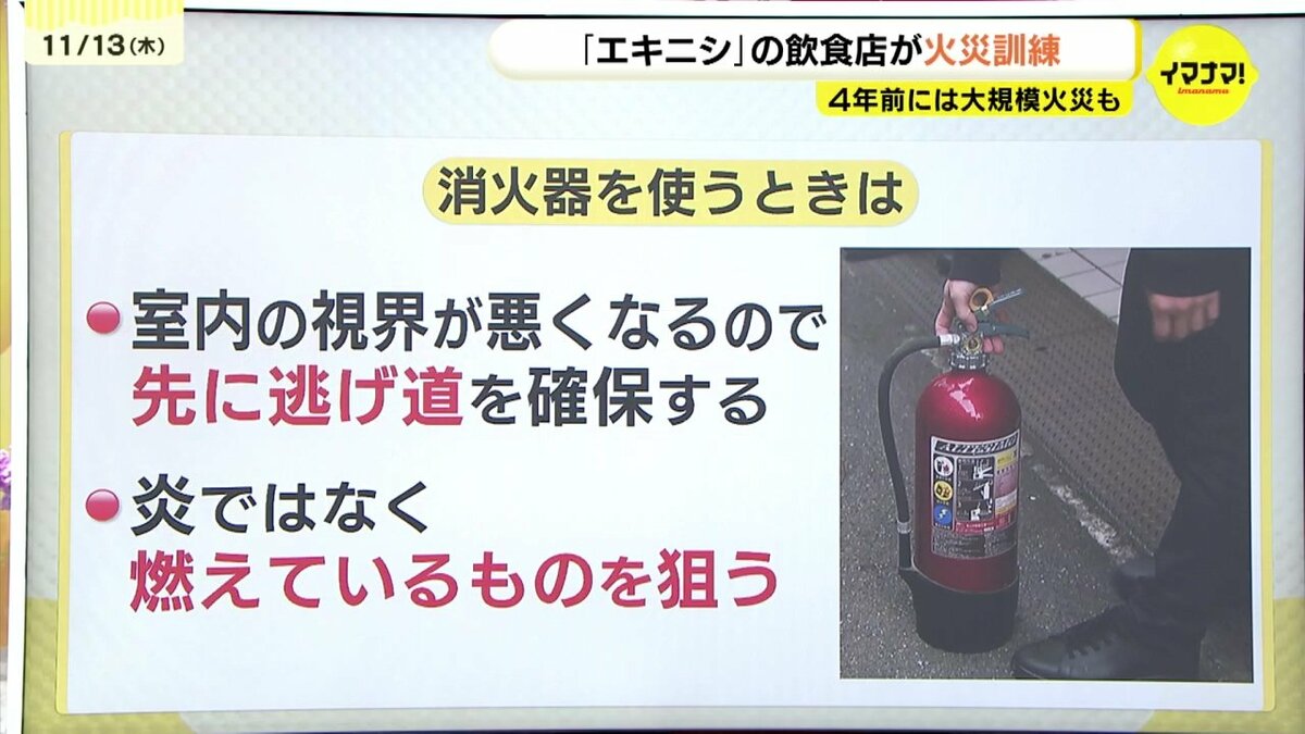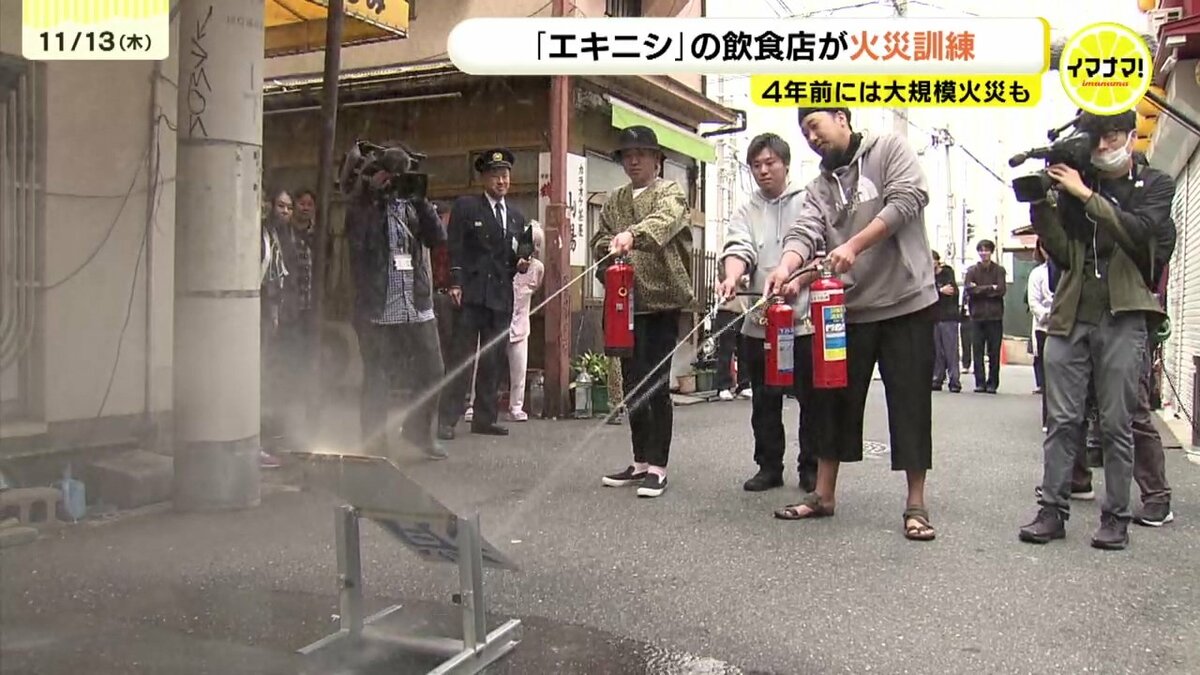 その惨事を繰り返さないため、毎年訓練が実施されていて、13日は飲食店の経営者や従業員などおよそ30人が参加しました。参加者は、消火器を使った初期消火の練習などを通じて、万が一、火事が起きた場合にはどうすればよいのか再確認していました。
