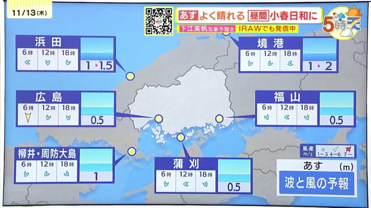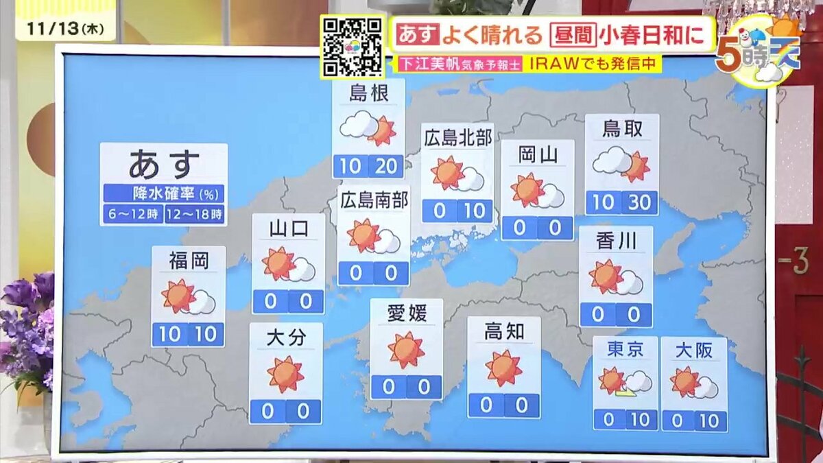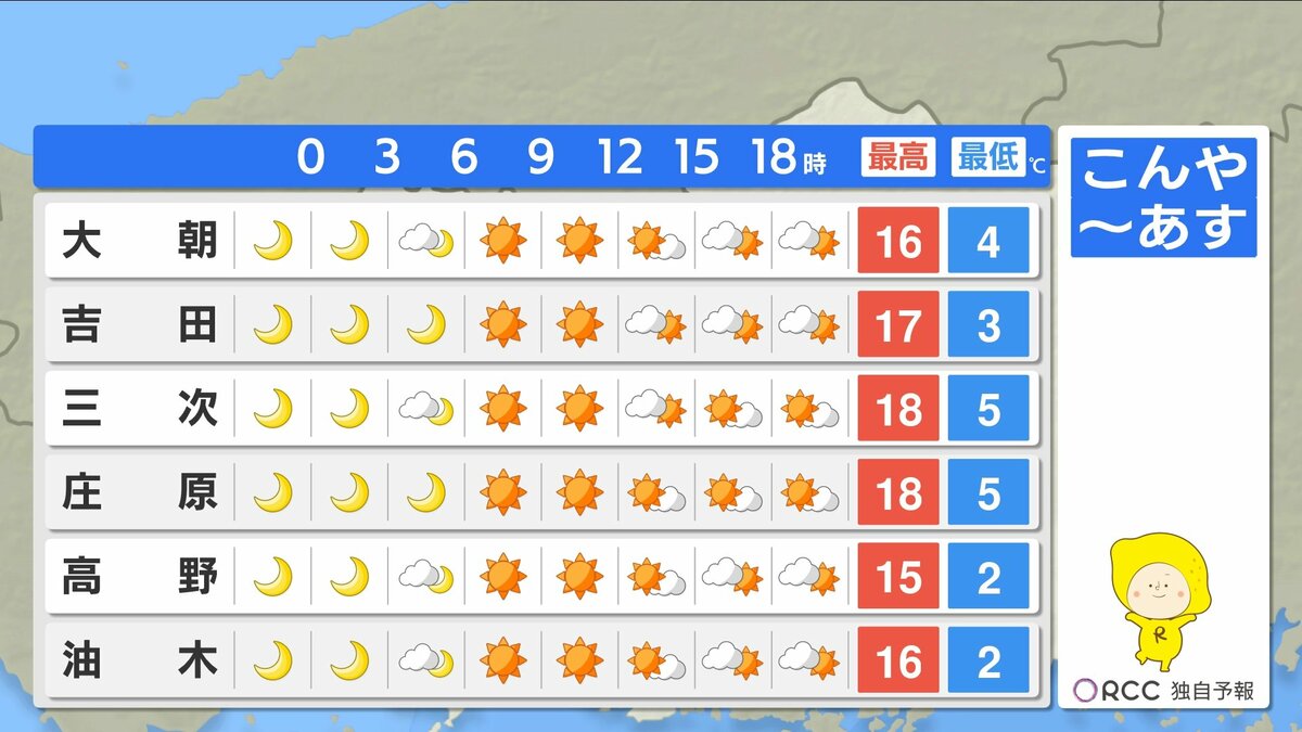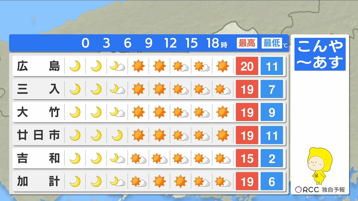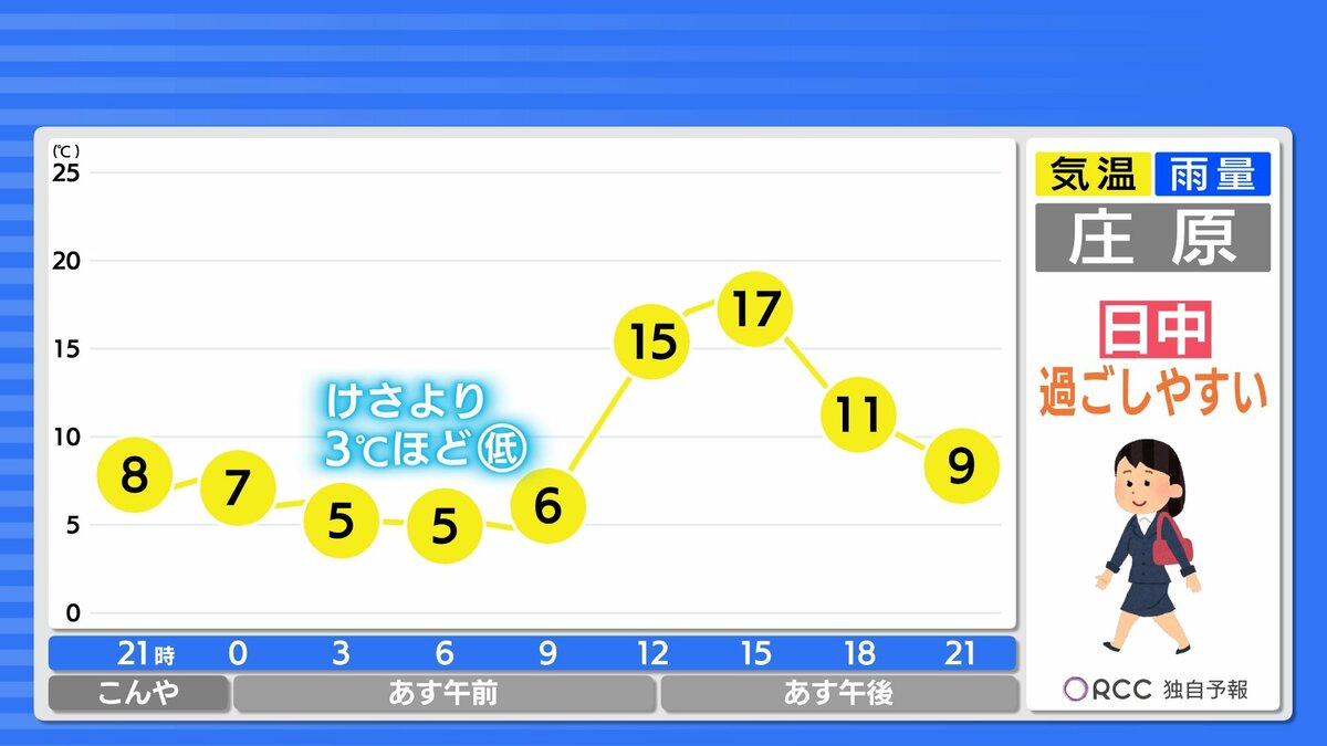 きょう13日(木)の広島県内は、曇り空で日差しが届きにくい一日で、夜中はにわか雨の地点もありました。朝の冷え込みは各地で大幅に緩みましたが、昼間も空気が冷たくひんやりした一日でした。ただ、風が弱く過ごしやすくなりました。