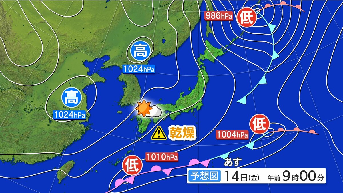台風26号は温帯低気圧に変わり、秋雨前線と一体化して、引き続き本州の南に停滞した状態になります。県内は、あすは高気圧に覆われ安定して晴れるでしょう。雲が広がっても日差しを遮るほどではないでしょう。空気の乾燥にご注意ください。