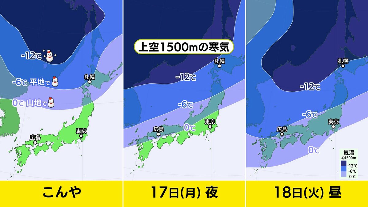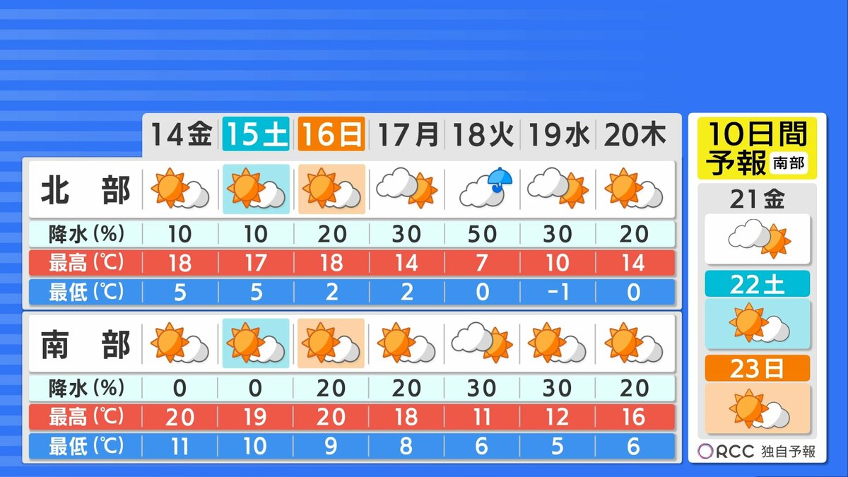 来週月曜日にかけておおむね晴れるでしょう。来週は強い寒気が流れ込み、山地を中心に雪化粧する可能性があります。冬用タイヤへの履き替えなど、はやめの冬支度をお願いします。今週いっぱいは日中の気温が20℃近くまで上がる日が多く、一日の寒暖差が大きくなります。来週は一気に気温が下がり、来週火曜日は12月中旬から下旬並みの気温になるでしょう。