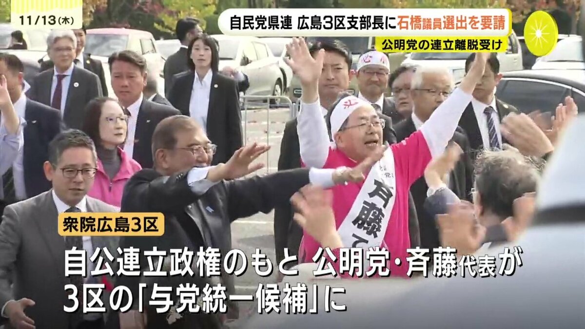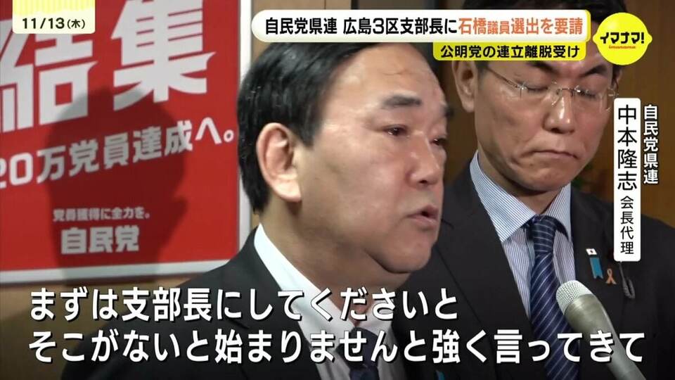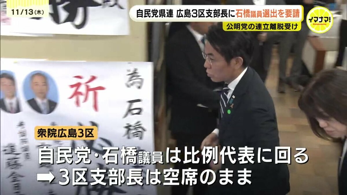 自民党県連は13日、公明党の連立離脱を受け、空席となっている衆議院広島3区の支部長に、比例代表の石橋林太郎議員を選ぶよう党本部に要請しました。