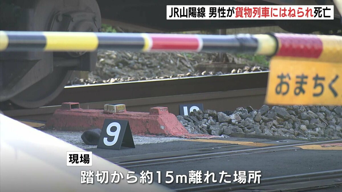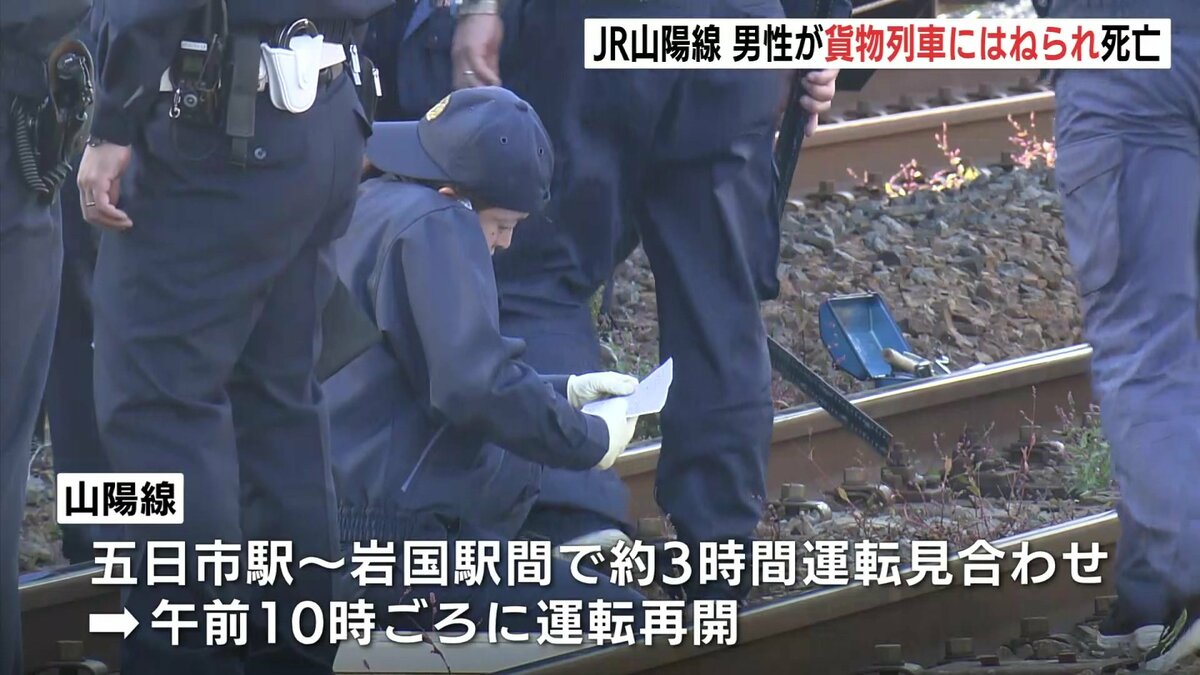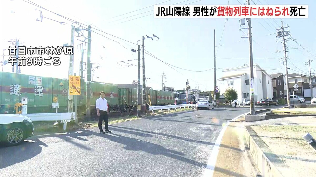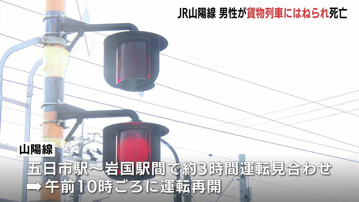 事故があったのは、廿日市市林が原です。JRと警察によりますと、午前7時すぎ「貨物列車が人と接触した」と列車の運転士から通報がありました。ブレーキをかけましたが間に合わず線路内にいた男性をはねたとみられています。はねられたのは成人男性で、現場で死亡が確認されたということです。この事故の影響で、山陽線は、五日市駅と岩国駅の間で、およそ3時間にわたって運転を見合わせていましたが、JR西日本によりますと、午前10時ごろに運転を再開しました。現場は踏切から15メートルほど離れた場所とみられ、警察は身元の特定を進めるとともに、事故の詳しい原因を調べています。
