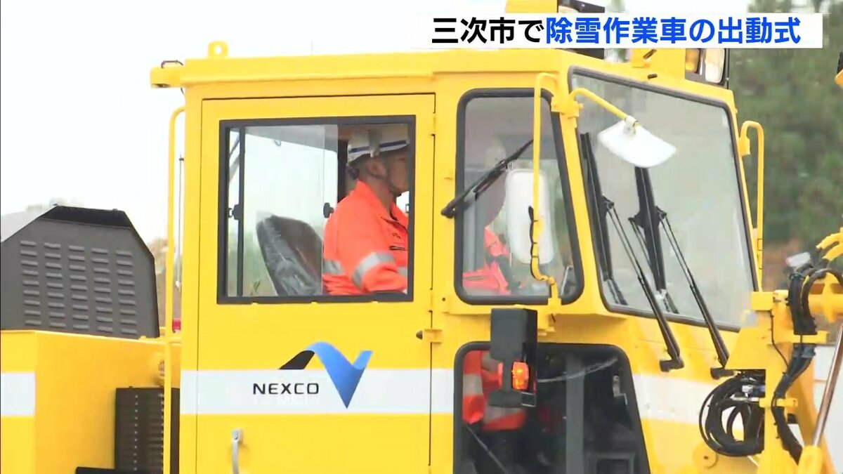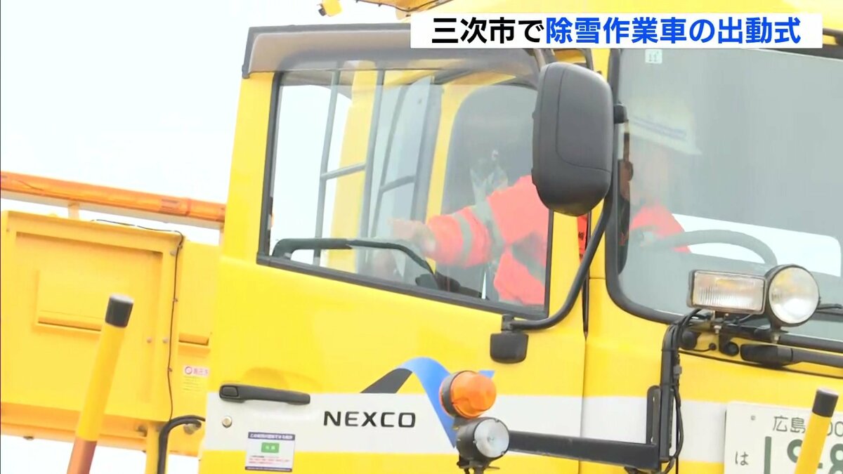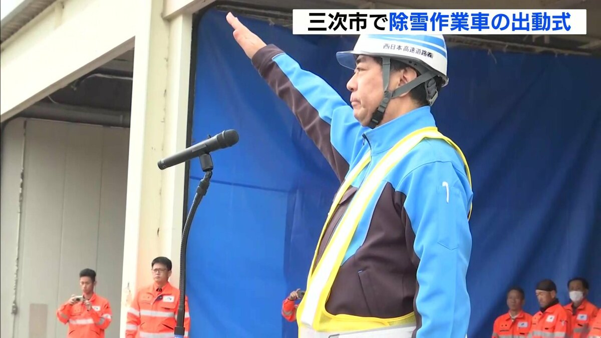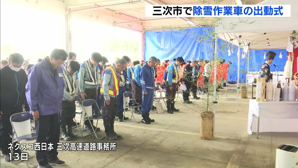 冬の高速道路で、除雪などにあたる作業車の出動式が、13日、三次市でありました。