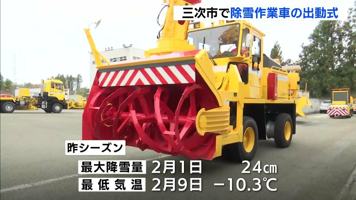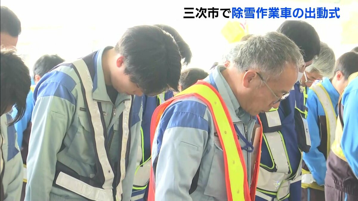 ネクスコ西日本三次高速道路事務所の出動式には、関係者約100人が参加しました。会場には、除雪車や凍結防止剤を散布する車が集まり、関係者が今シーズンの作業の安全を願っていました。三次高速道路事務所は安芸高田市の高田インターチェンジから、岡山県の新見インターチェンジまでの92・1キロで、凍結防止や除雪作業などを担当しています。昨シーズンの出動は96日で、降雪量が20センチを超えたり、気温がマイナス10℃を下回ったりする日もありました。