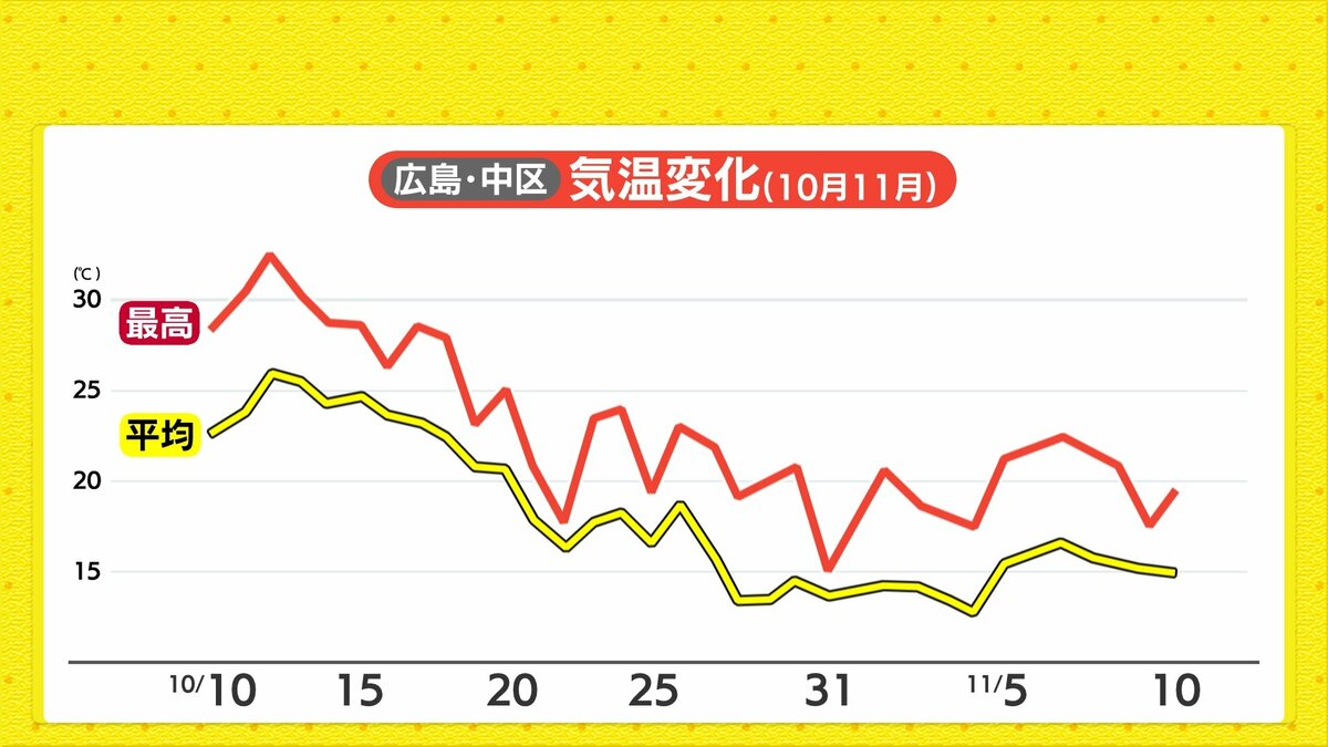 最近は、朝晩の冷え込みが強まり一日の寒暖差が大きく、秋が深まっています。思い返すと10月前半は厳しい残暑が続き、広島市中区の気温を振り返ると、最高気温は30℃を超えていた時期もありました。