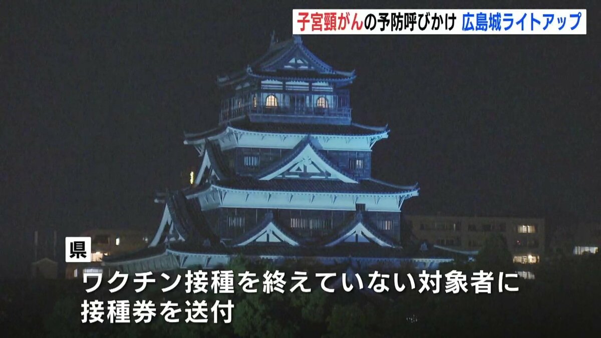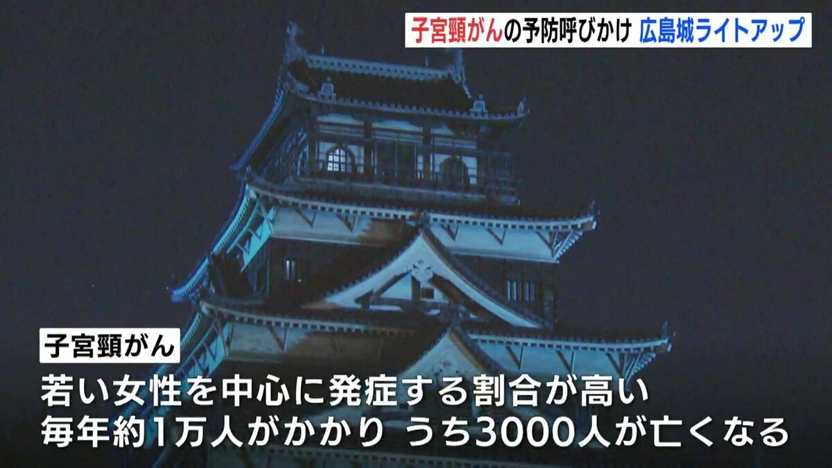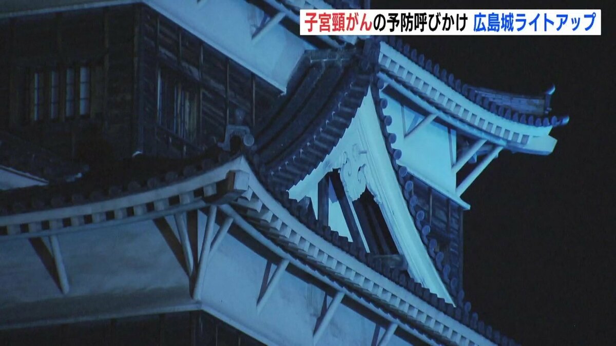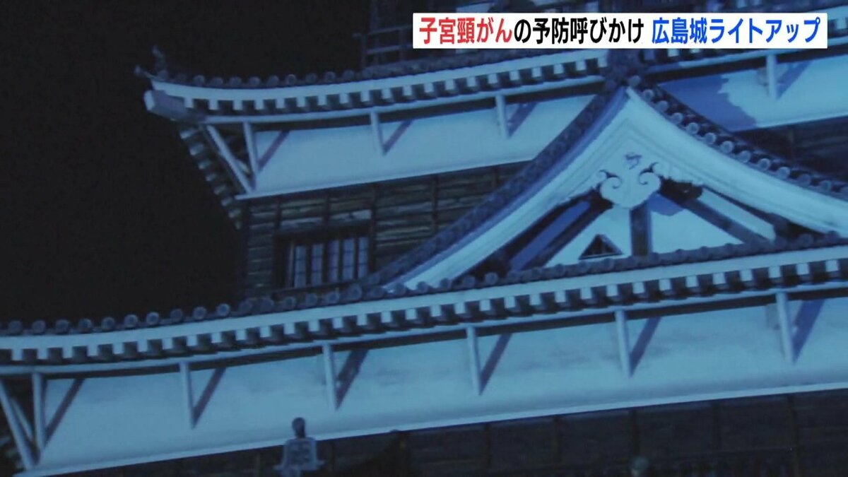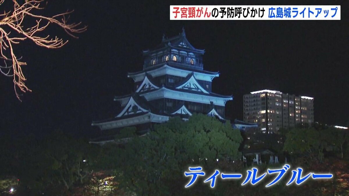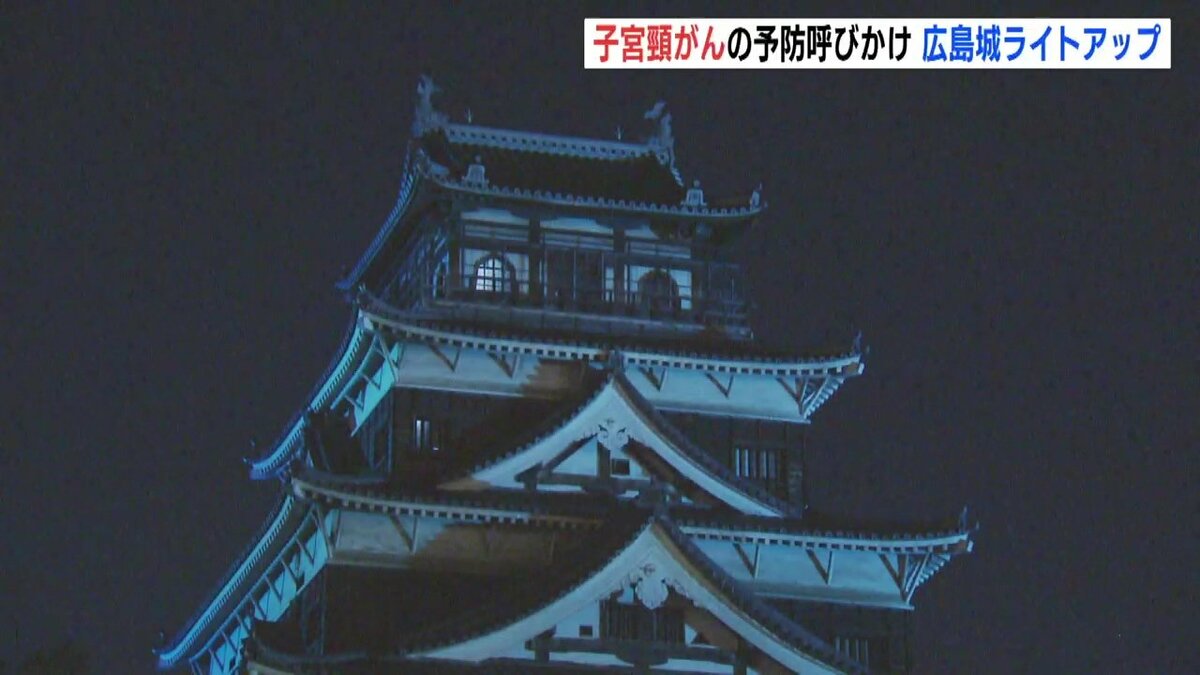 広島市にある広島城が普段とは異なる「ティールブルー」に照らされました。ライトアップは子宮頸がんを予防するためのワクチン接種や検診を呼びかけようと企画されました。