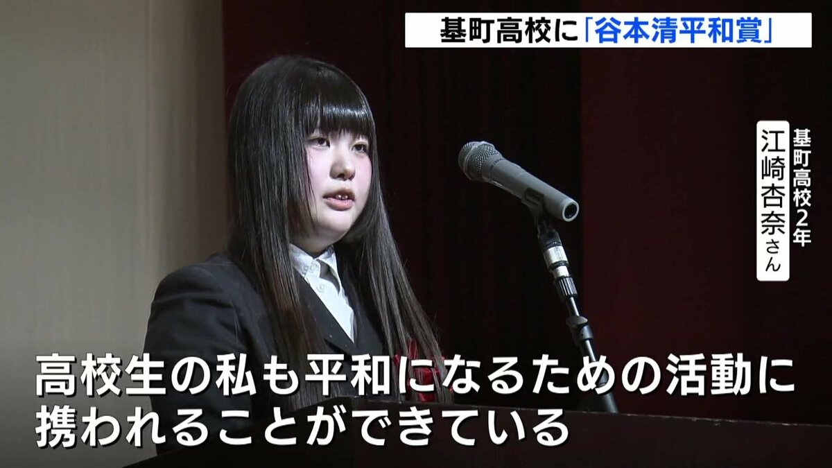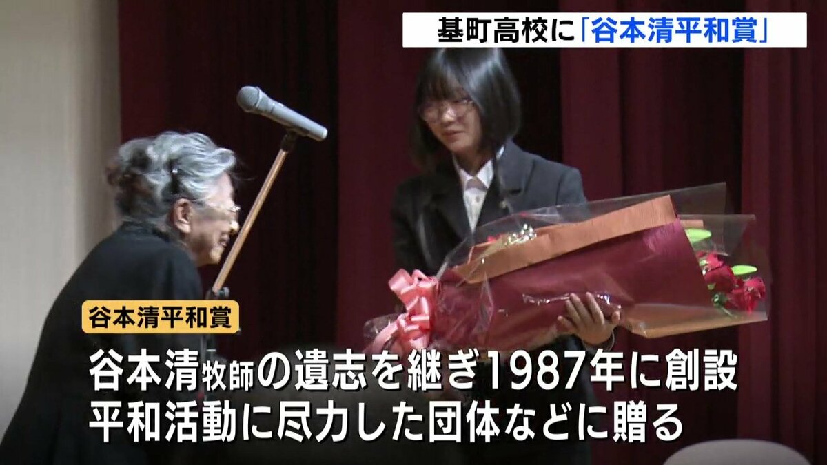 世界平和の実現に向けて貢献した人や団体に贈られる「谷本清平和賞」の贈呈式が、16日広島市で開かれ、基町高校が表彰されました。