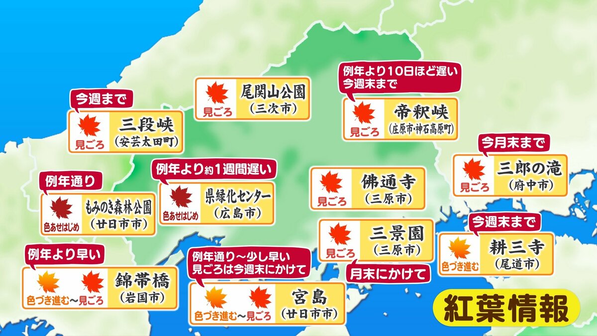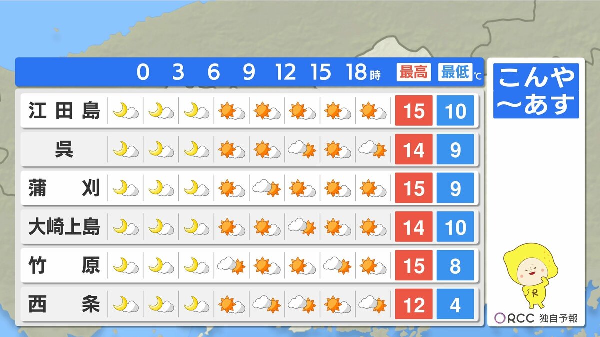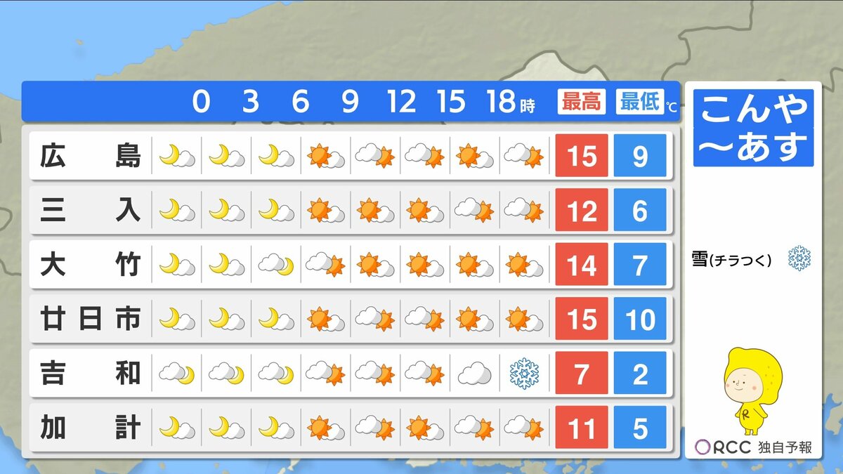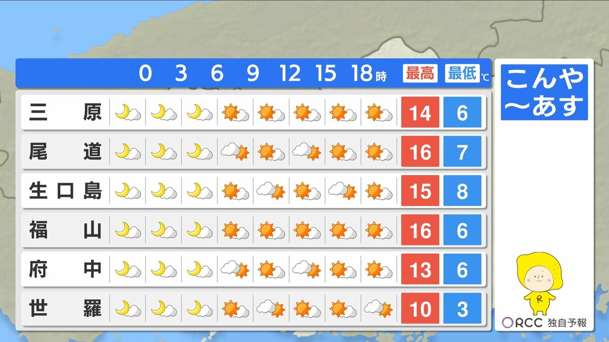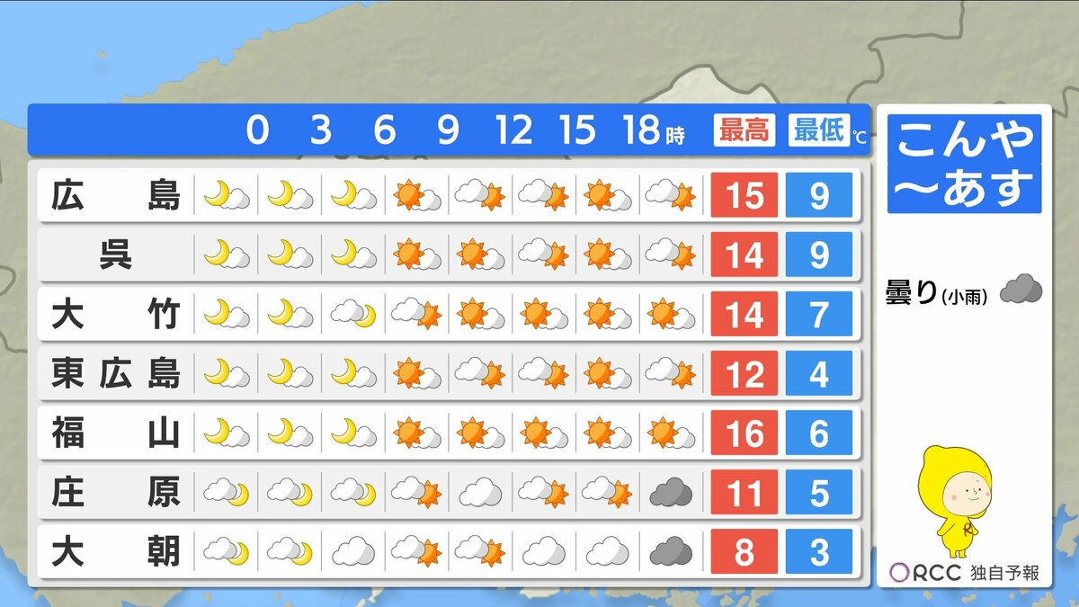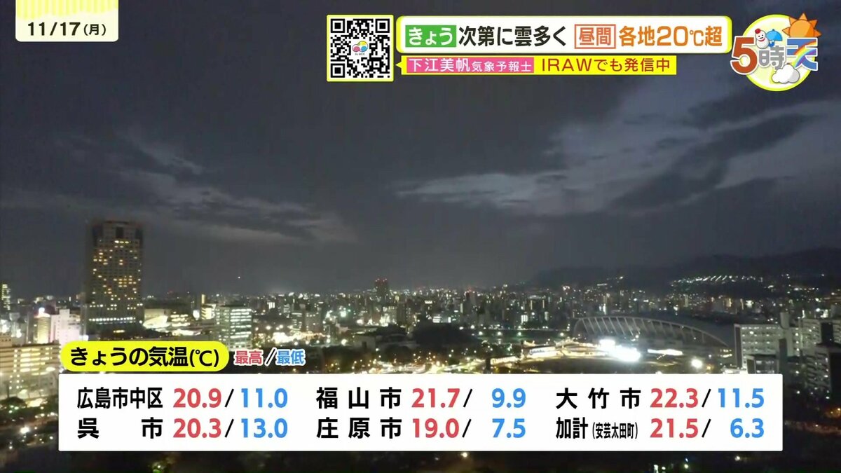 きょう17日(月)の広島県内は、昼過ぎにかけてよく晴れて、日中はぽかぽか陽気になりました。最高気温は20℃を超えた地点が多く、小春日和でしたね。午後はだんだんと雲が広がり、にわか雨の地点もありました。