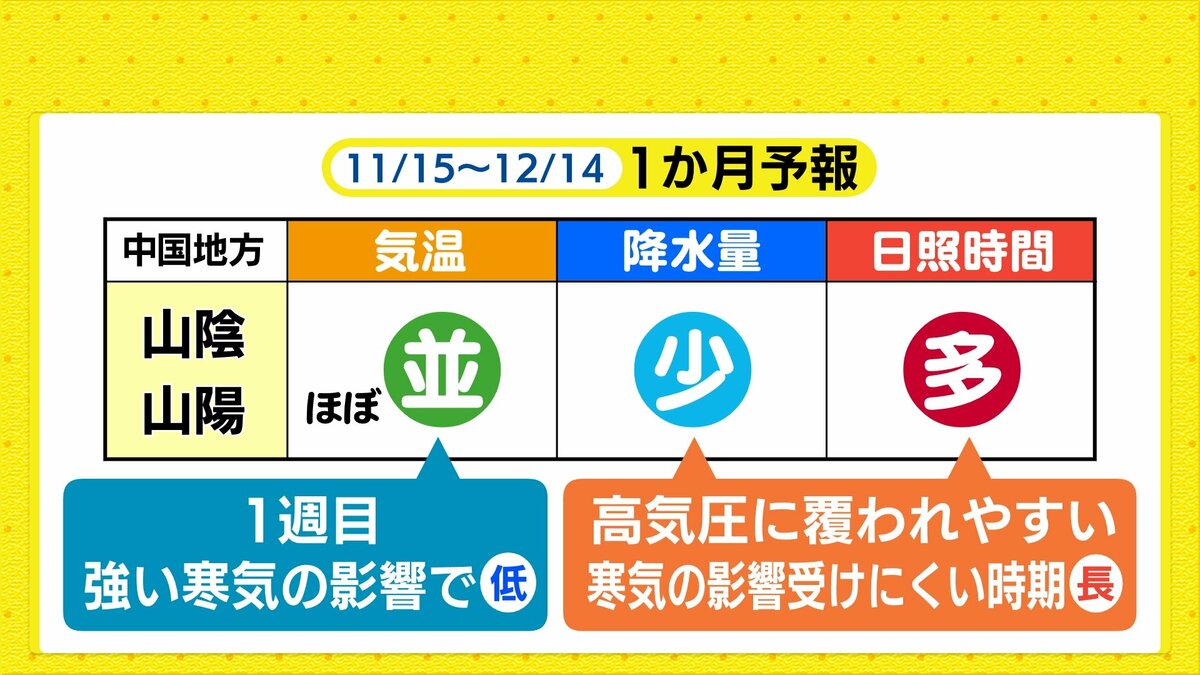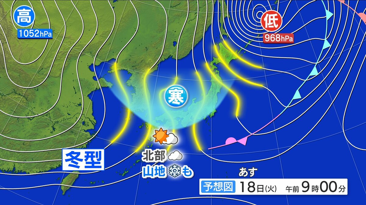 この後あさってにかけて西高東低の冬型の気圧配置になります。上空にこの時期としては強い寒気が流れ込む見込みです。南部ではおおむね晴れますが、北部は寒気の影響で雲が広がりやすく、山地を中心に雪が混じる可能性があります。