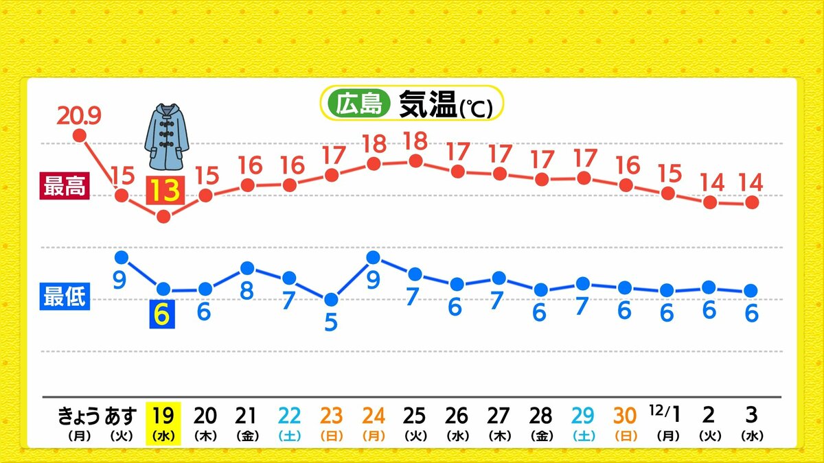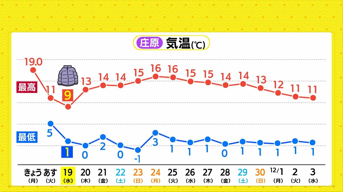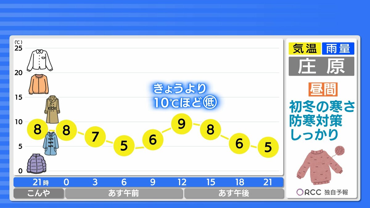あすの最低気温は、けさよりも2℃~4℃ほど低くなり、さらに冷え込みが厳しくなります。最高気温は、きょうよりも5℃~10℃ほど低くなり、一気に初冬の寒さがやってきます。