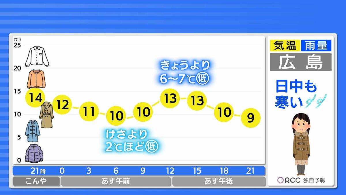 あすは西よりの風が強めに吹くので、体感は数字以上に寒く感じられるでしょう。冬物の厚手のコートやダウンコートの出番となります。防寒対策をしっかりしてからお出かけください。