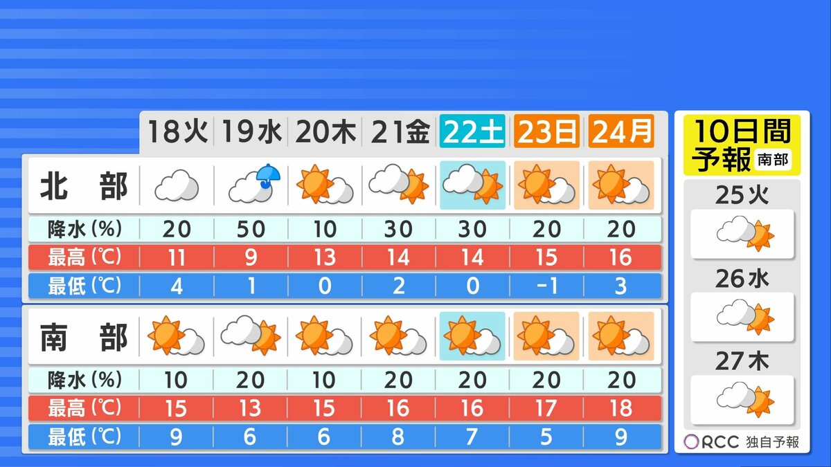 南部ではしばらくおおむね晴れるでしょう。北部は、あすからあさってにかけて寒気の影響で雲が広がりやすく、あすの夜からあさってにかけて標高が高い所では雪が舞ったり、雪化粧する可能性があります。