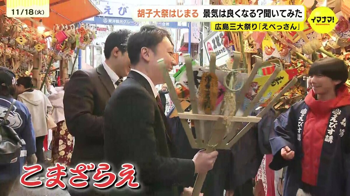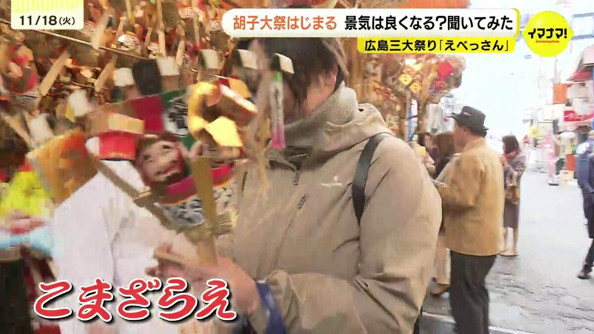 胡子大祭=えべっさんは、400年以上の歴史がある祭りです。被爆直後の1945年も、バラックで社殿を建て、祭りは途切れることなく続いていると言われています。広島市中心部の胡子神社の周辺では、福をかき集める縁起物の熊手=「こまざらえ」を買い求める人などでにぎわいました。