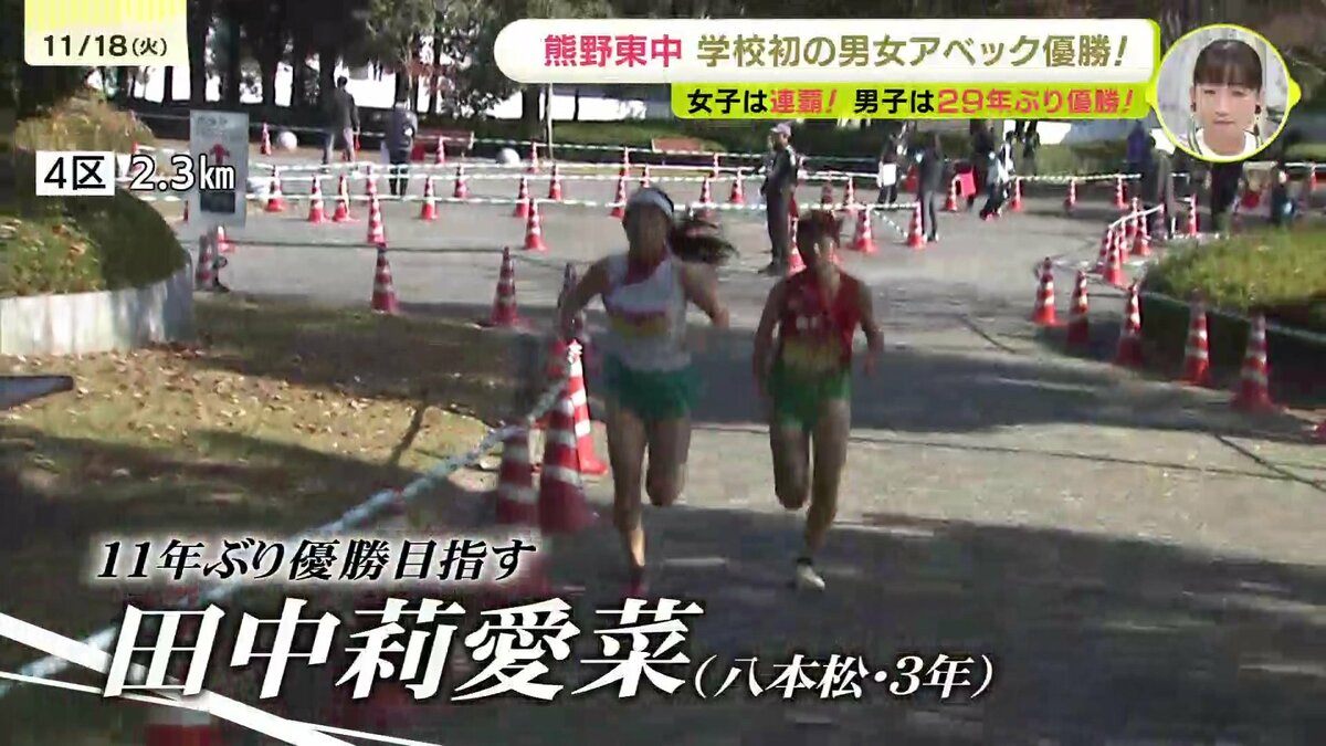 しかし、ほかのチームも黙っていません。11年ぶりの優勝を狙う八本松が4区・田中莉愛菜で逆転し、トップに立ちます。連覇を狙う熊野東に23秒差をつけ、勝負は最終5区へ。
