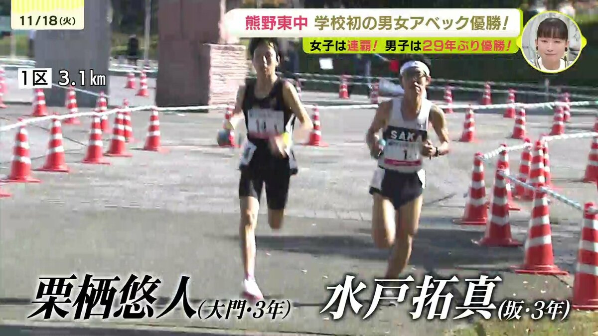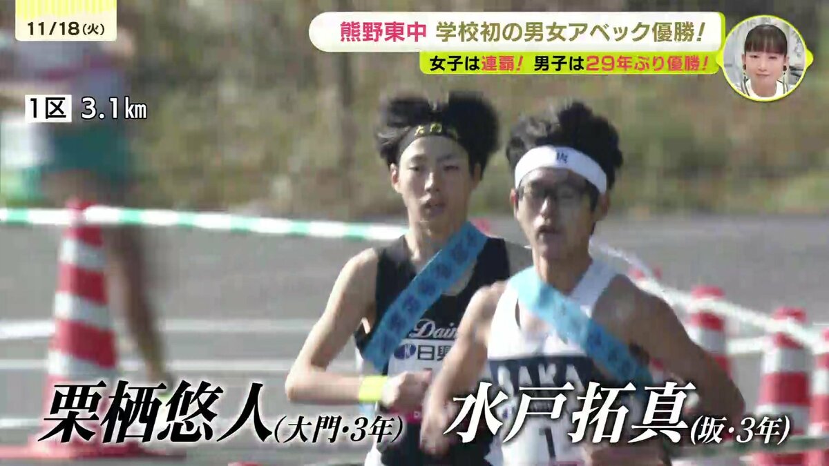 一方、男子の部では、1区は注目のランナー対決。坂の水戸拓真と大門の栗栖悠人の、激しいつばぜり合いが続きますが、トラック目前で大門の栗栖がラストスパートで先頭に。