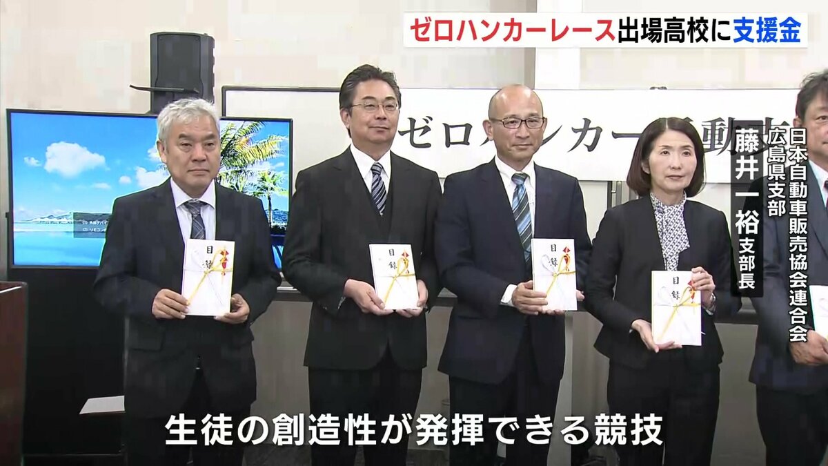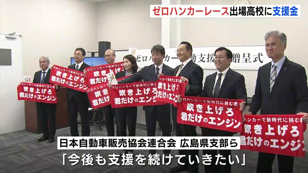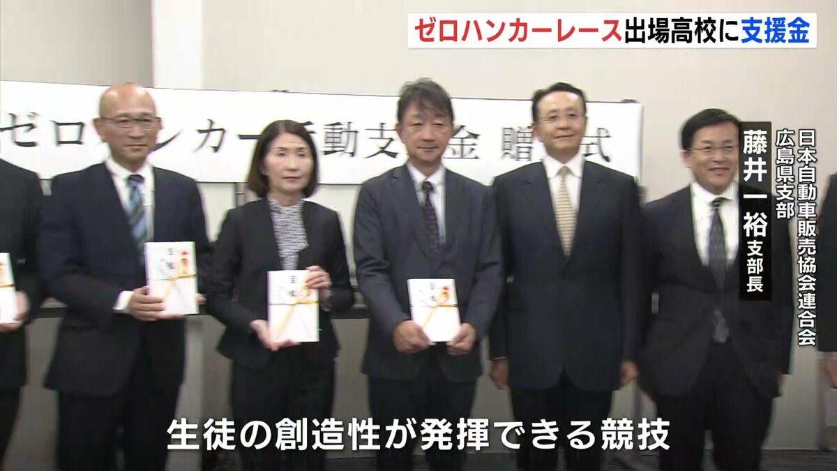18日、広島県内5つの高校に支援金を贈ったのは、「日本自動車販売協会連合会広島県支部」ら3団体です。