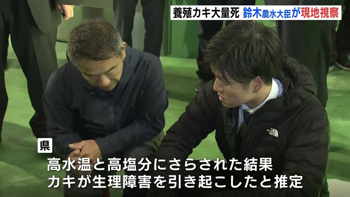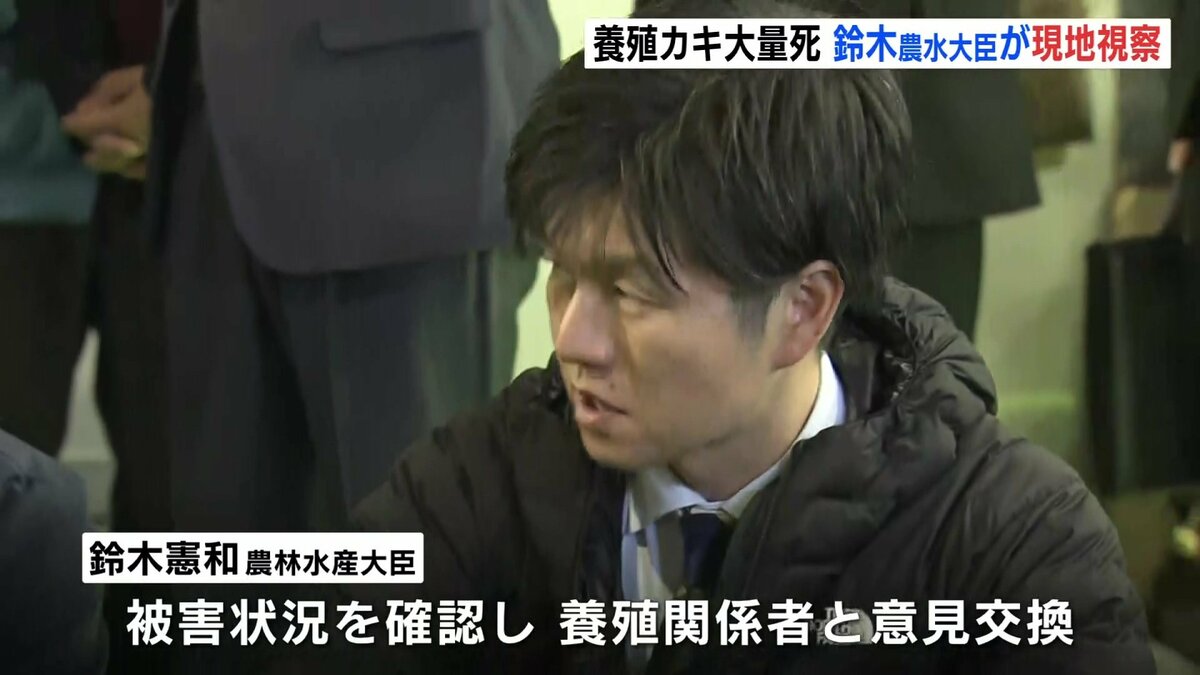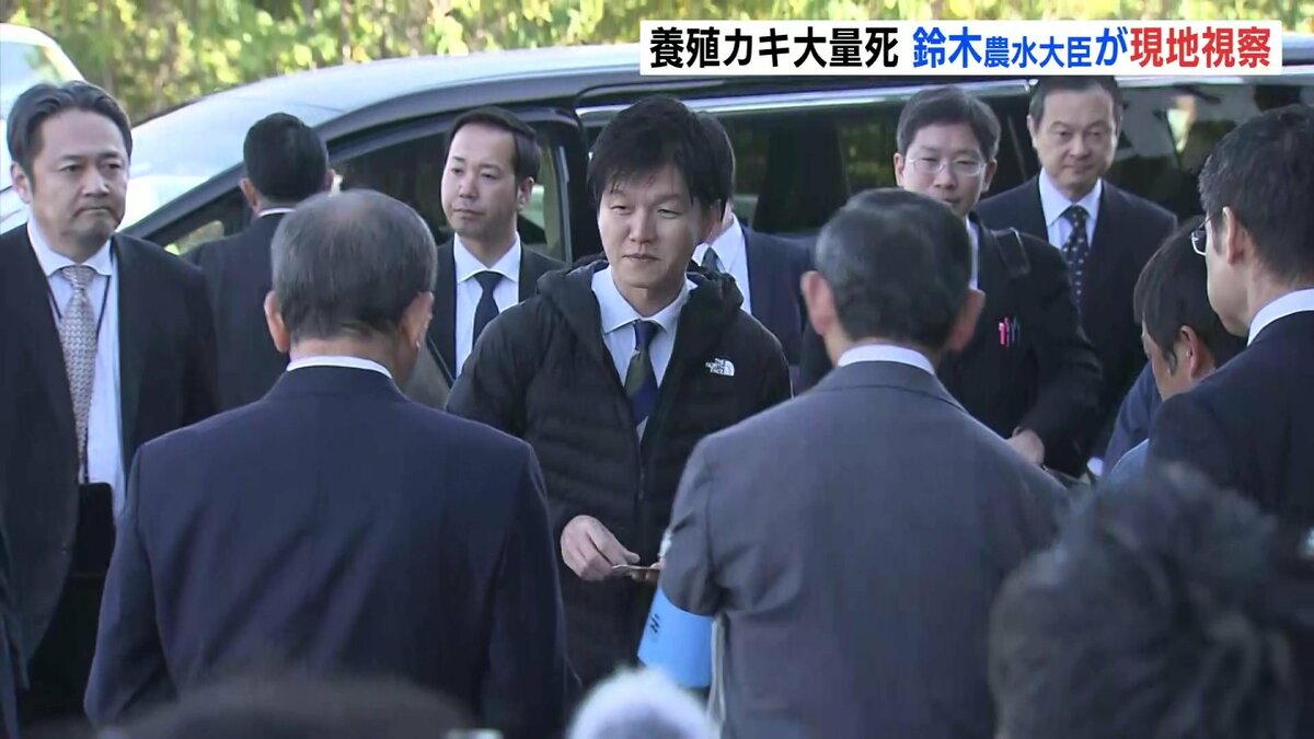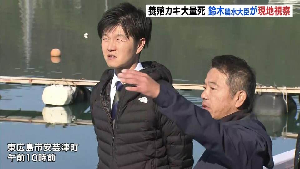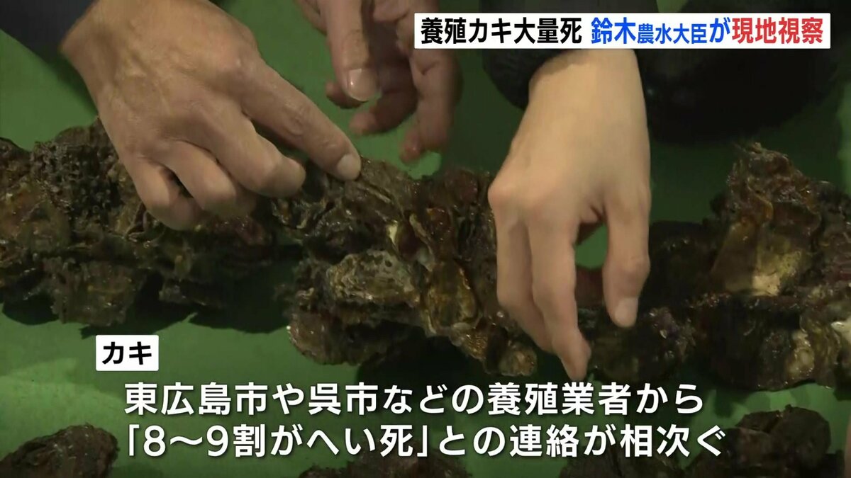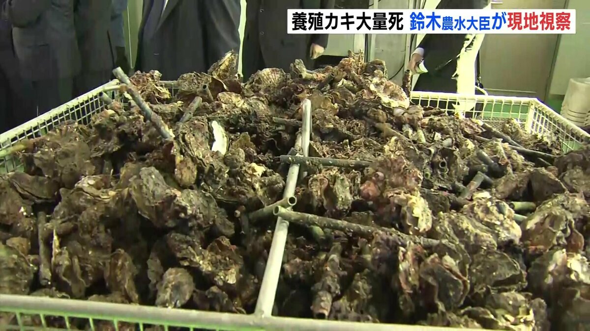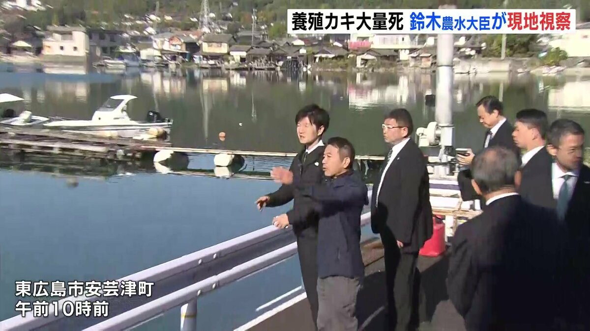 広島県内で養殖されているカキが大量死している問題を受け、19日朝、農林水産省の鈴木大臣が現地を視察しました。