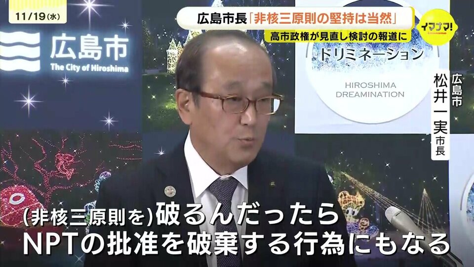 高市政権の内部では、非核三原則のうち「持ち込ませず」について、見直しに向けた議論を検討していると報じられています。広島市の松井市長は19日の会見で、「国民の理解を深めるために議論はするべきだ」としたうえで、「NPT=核拡散防止条約を批准している国として、核の領域を縮める義務があり、非核三原則の堅持は当然のことだ」と述べました。