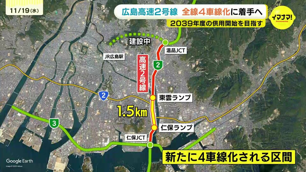 広島高速2号線は、広島市東区の温品ジャンクションと仁保ジャンクションを結ぶおよそ5.9kmの路線です。このうち、暫定2車線で運用されている東雲ランプから仁保ランプまでの1.5kmが新たに4車線化され、高速2号の全線が4車線になります。