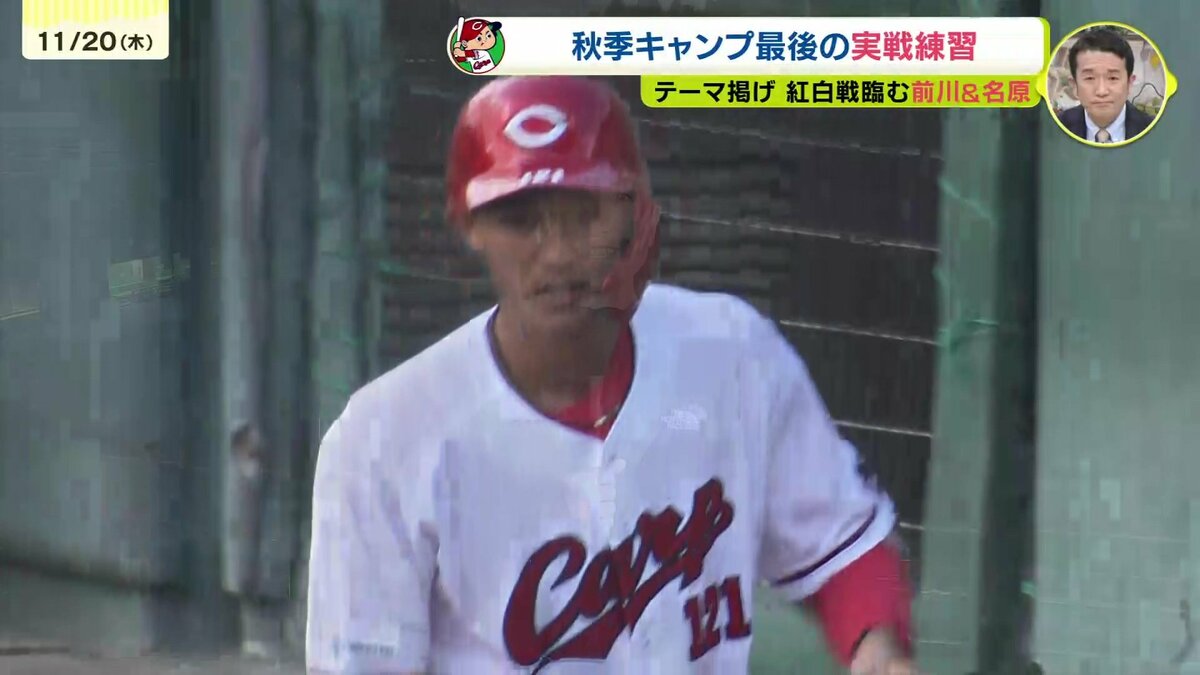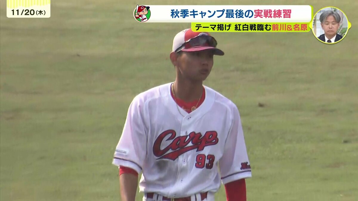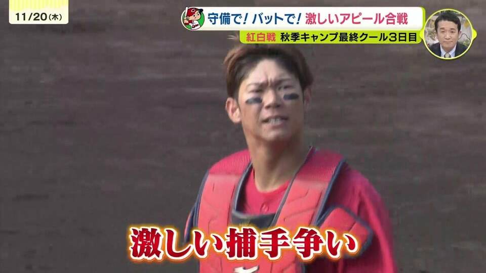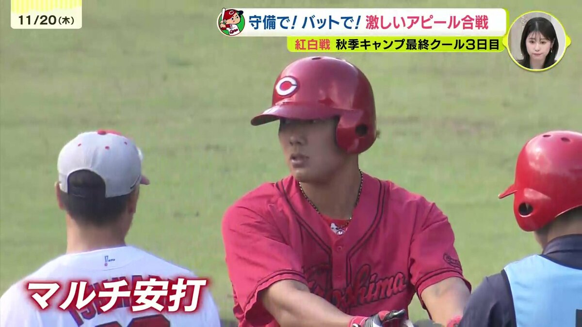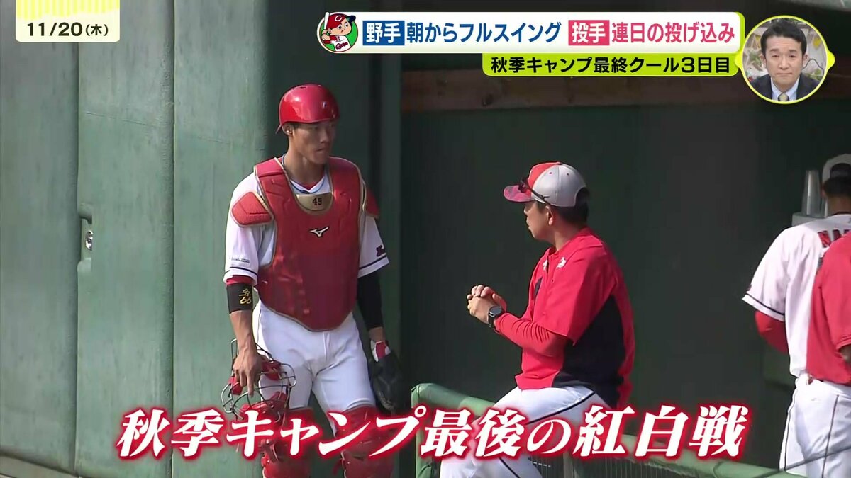 そして午後からおこなわれたキャンプ最後の紅白戦で輝いていたのが、このキャンプ注目のキャッチャー。再挑戦している二俣翔一が盗塁を阻止をすると、さらにピッチャーの投げたワンバウンドボールもしっかり止めるなど首脳陣からの評価も高まっています。一方、坂倉将吾も黙っていません。すかさず盗塁阻止。