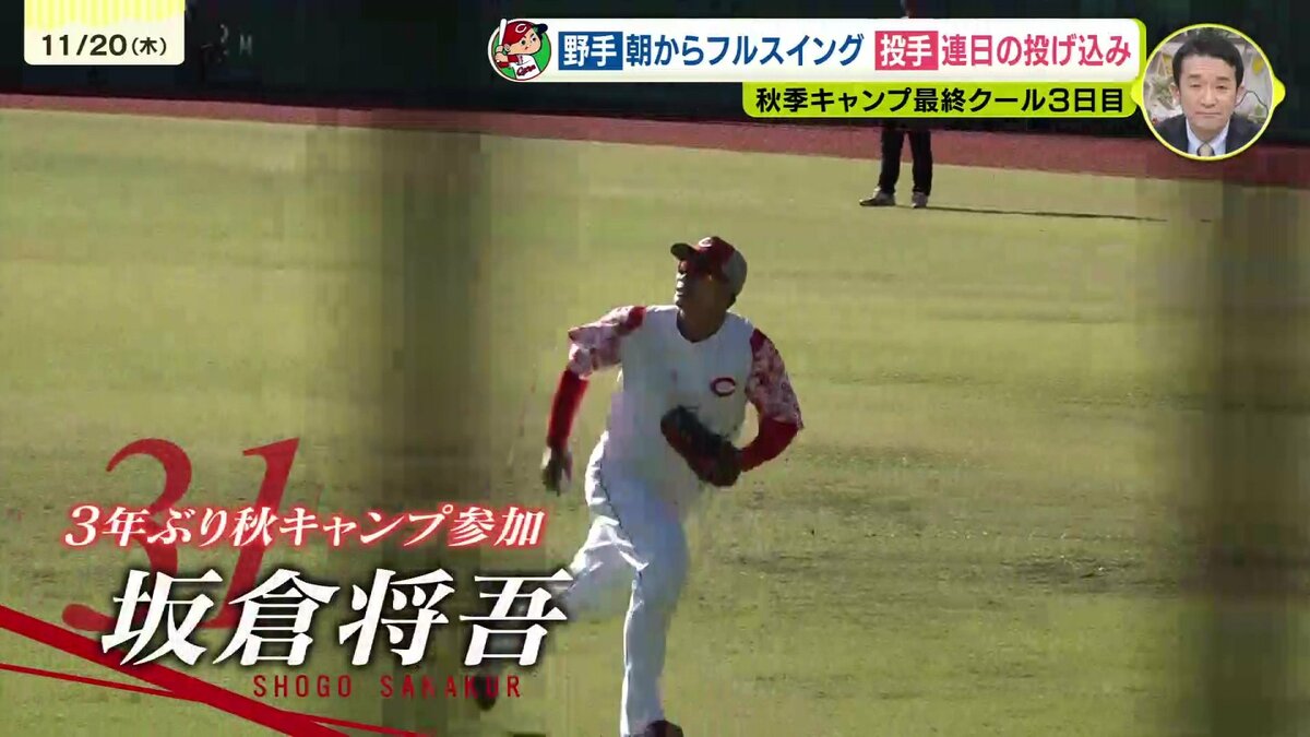 21日で打ち上げとなるカープの日南キャンプ。残すところあと2日となった20日のグラウンドには朝から眩しい日差しが降り注ぎ10時前には15度を超えたました。野手陣は午前中からバッティング練習でフルスイング!午後からの紅白戦に備えます。3年ぶりに秋キャンプに参加している坂倉将吾は外野でノックを受けました。