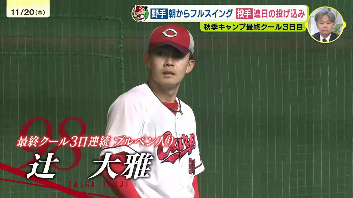 最終クールで唯一3日連続でブルペンに入ったのが今年支配下選手となった3年目の辻󠄀大雅。クイックのときに球威が落ちる課題を克服しようときょうは全球クイックで腕を振ります。そして50球を超えたあたりで終わろうとしましたが…突如、菊地原コーチがかけよります。