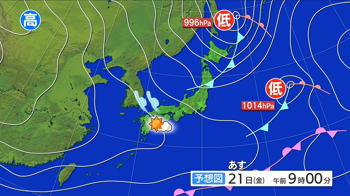 あすも高気圧の影響でおおむね晴れるでしょう。あすは北日本・東日本にかけて寒冷前線が通過する予想で、前線通過後は西風が強まりそうです。風が吹き、日陰に入るとかなりひんやりしますが、日差しのもとでは暖かく、過ごしやすくなるでしょう。