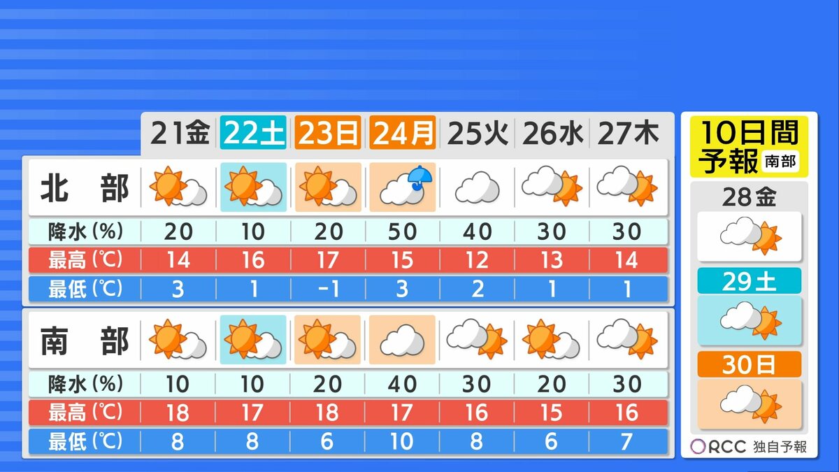 日中の気温は、平年並から平年を上回る日が続き、日差しが届くと過ごしやすい日が続きます。晴れる分放射冷却が効き、朝晩の冷え込みが強まる日が多いでしょう。しばらく朝晩の冷え込み、一日の寒暖差にご注意ください。
