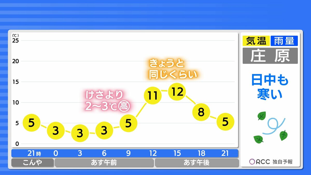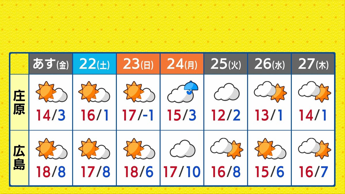 きょう20日(木)の広島県内は、14地点で今シーズン最も低い最低気温となり、今季一番寒い朝となりました。中でも、大朝で-2.8℃ 油木で-1.2℃など、5地点で最低気温が0℃を下回り、冬日となりました。