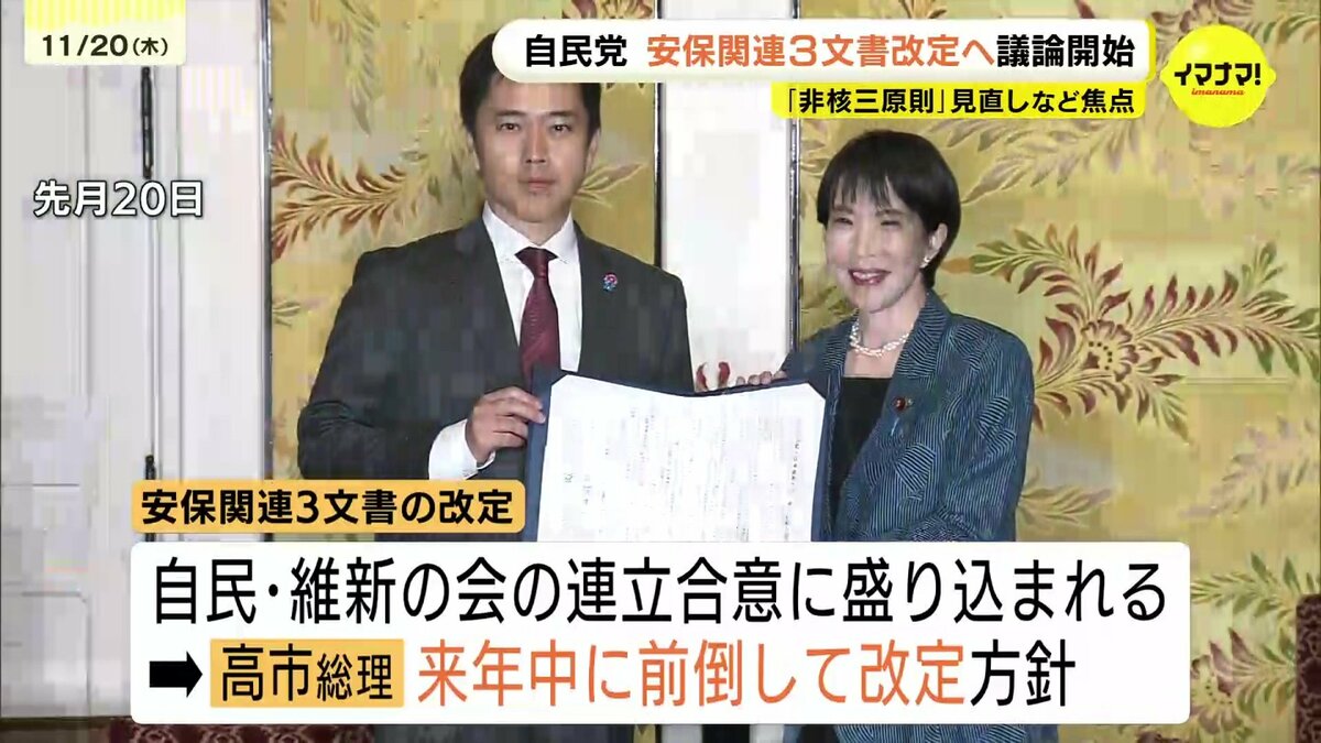 安保3文書の改定は自民党と日本維新の会の連立合意に盛り込まれているもので、高市総理は来年中に前倒して改定する方針を示しています。