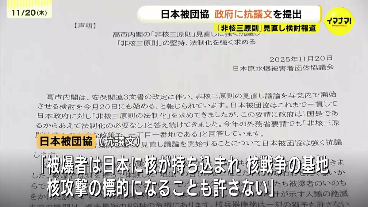 「非核三原則」については高市総理が、「見直しを検討する」との報道もあり20日、日本被団協は抗議文を出しました。